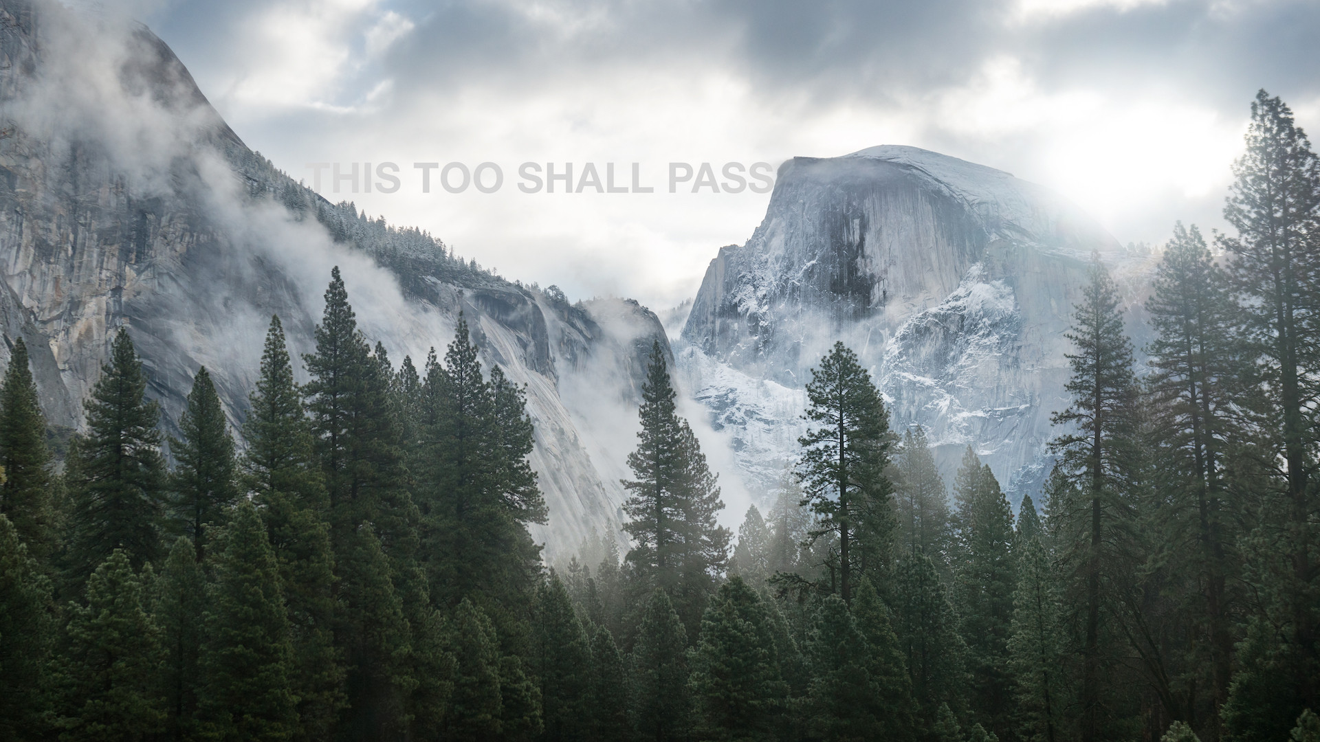 Description: A mountain with a forest below it and clouds in the sky above it and a few trees below it.