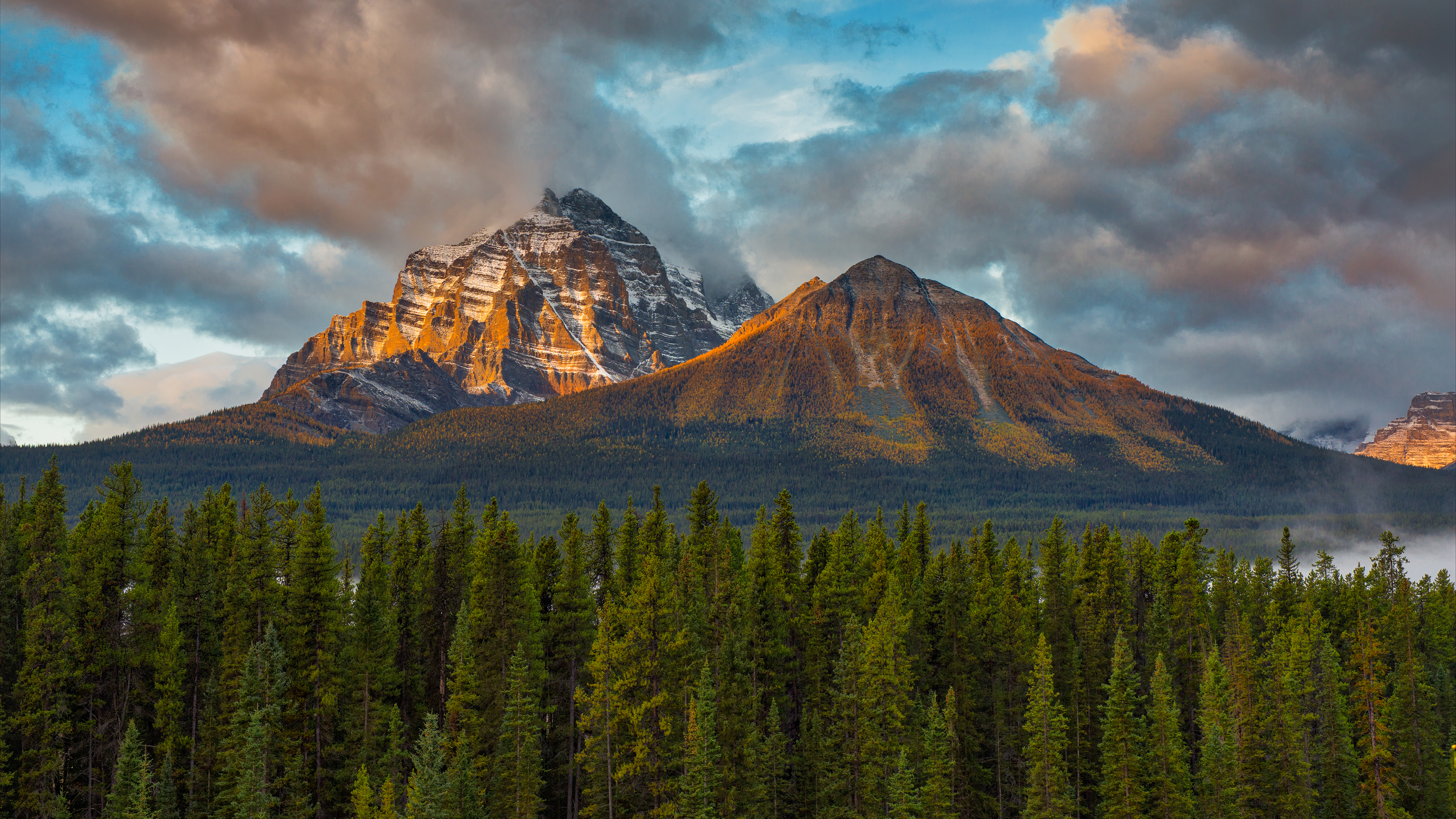 Description: A mountain with a forest below it under a cloudy sky with clouds and sun shining on it and a few trees in the foreground.