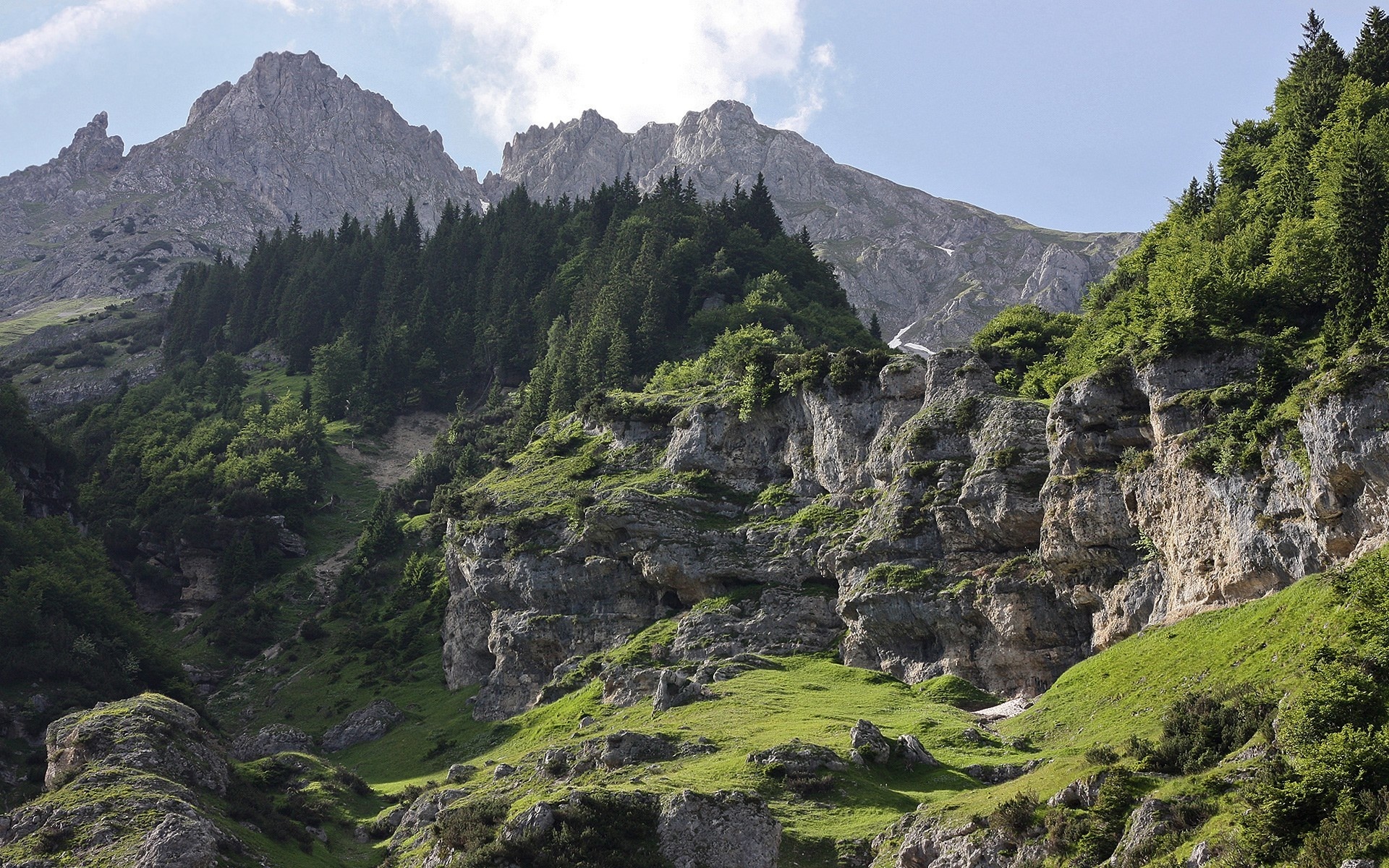 Description: A mountain with a few trees on the side of it and a few animals on the side of it.