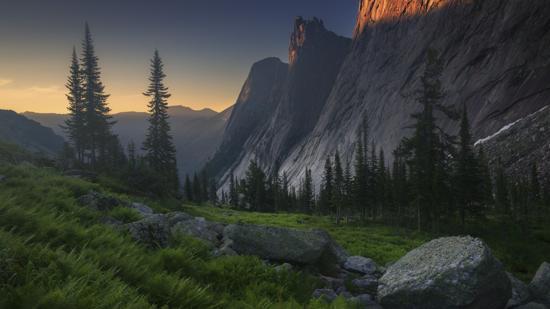 Description: A mountain with a forest and rocks in the foreground and a sunset in the background with a few clouds.