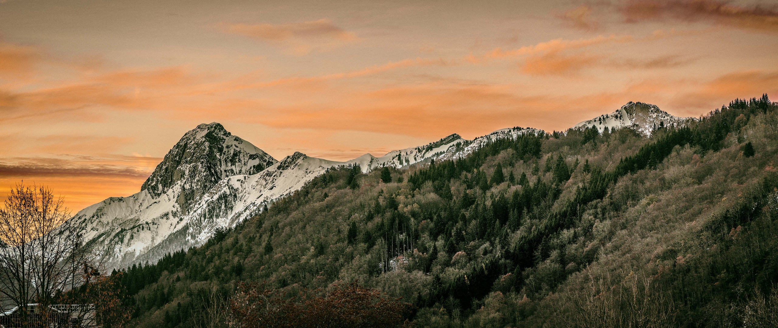 Description: A mountain with a forest on the side of it at sunset or dawn with a red sky in the background.
