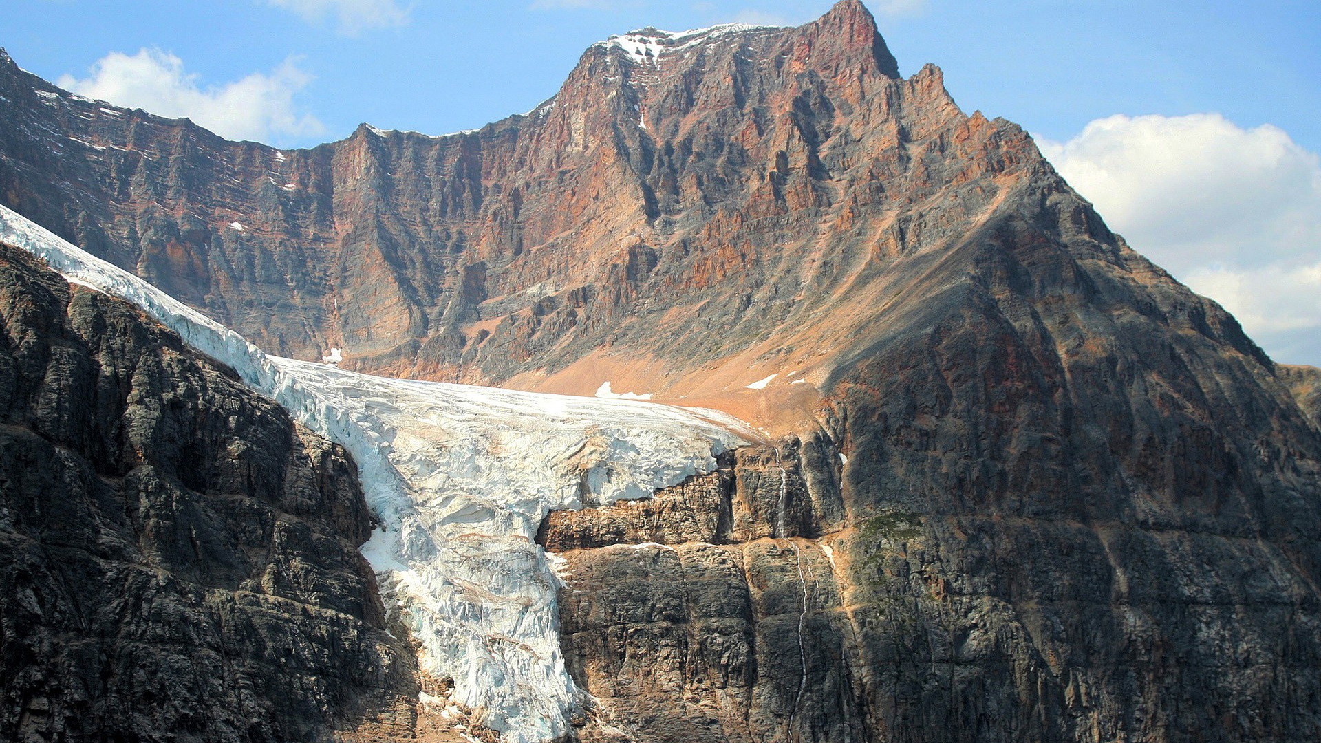 Description: A mountain with a glacier on it and a sky background with clouds in the sky and a few snow on the mountains.