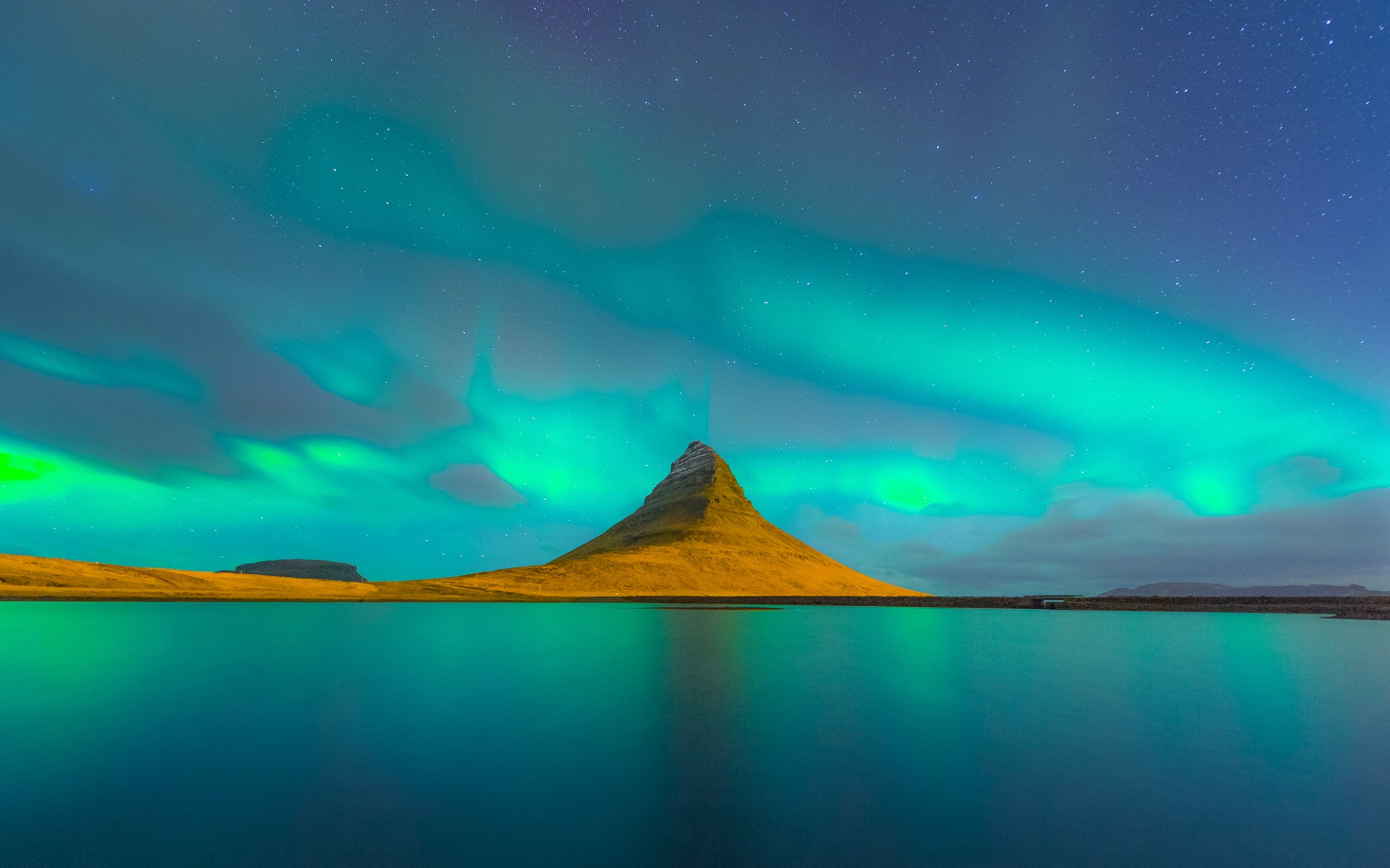 Description: A mountain with a green aurora light in the sky above it and a body of water below it with a mountain in the distance.