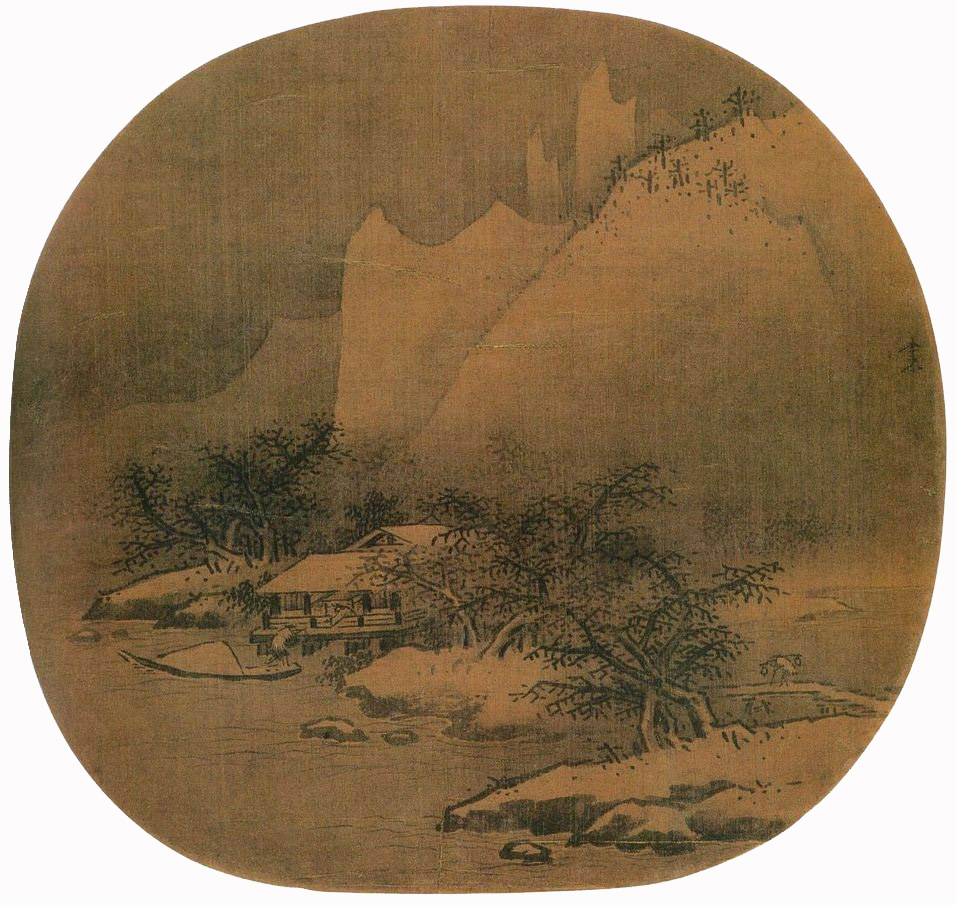 Description: A painting of a mountain scene with a house and trees in the foreground and a river running through it.