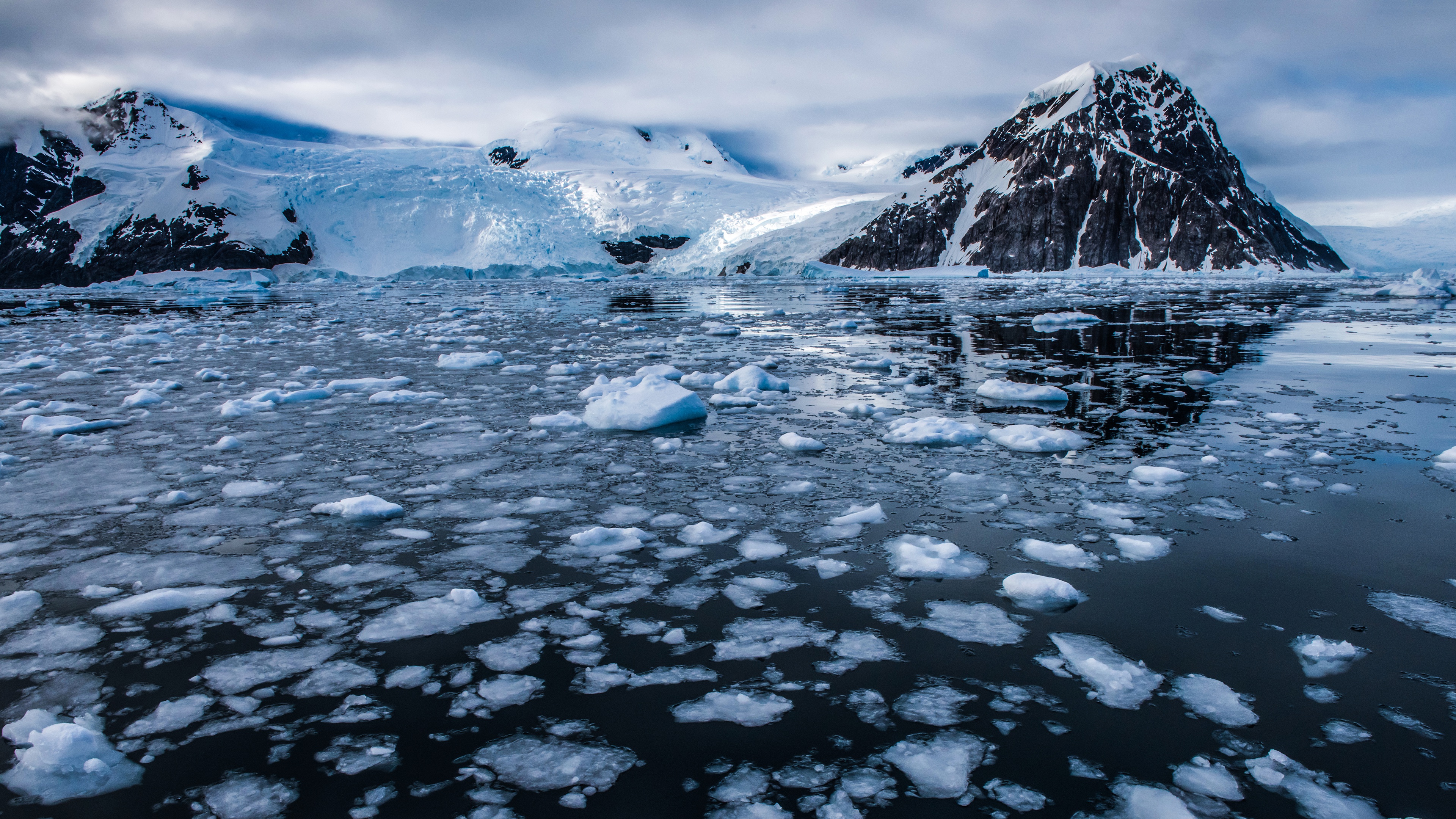 Description: A mountain covered in snow and ice with a lake in front of it and ice floes floating on the water.