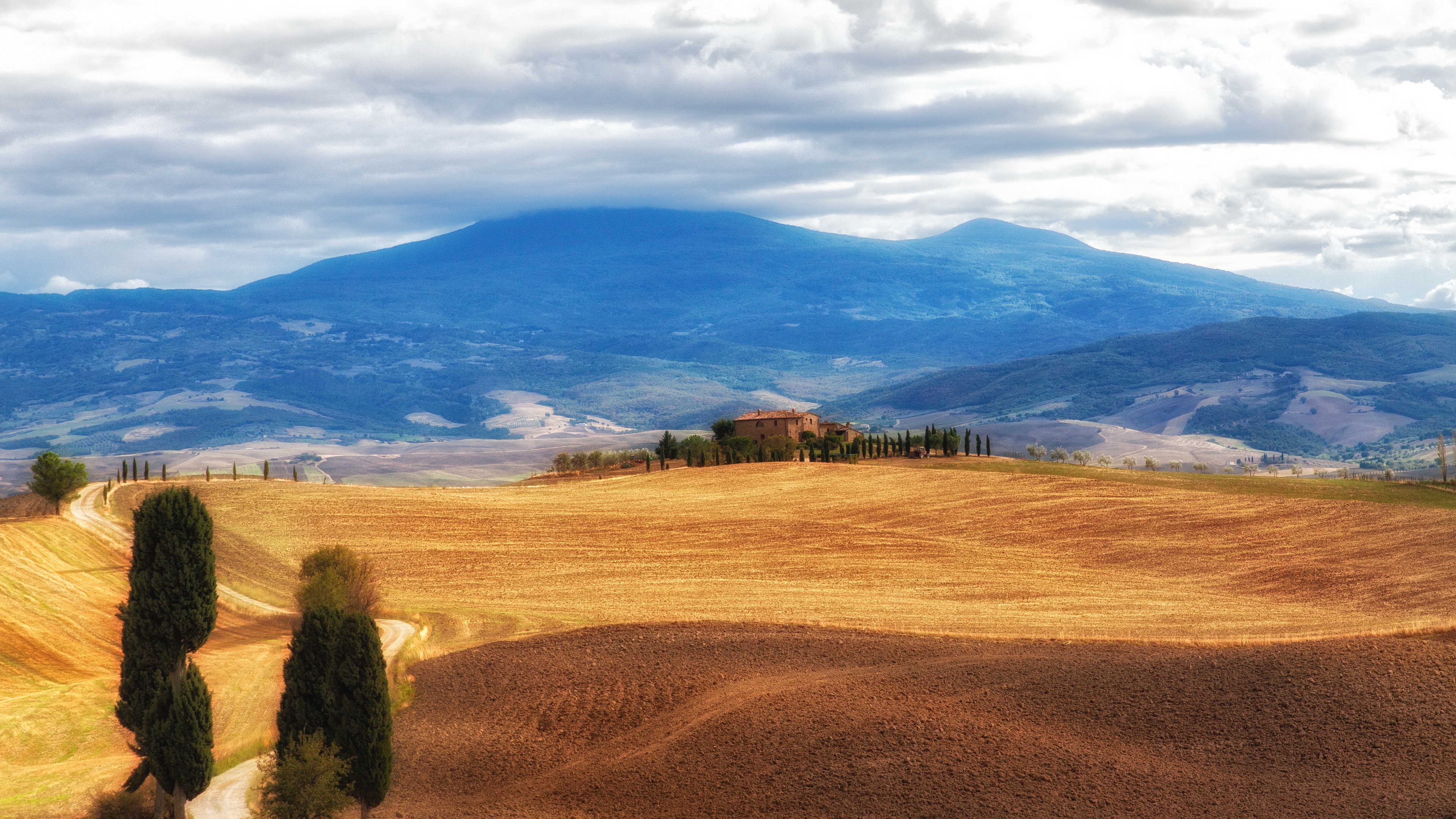 Description: A field with a house in the middle of it and mountains in the background with clouds in the sky.