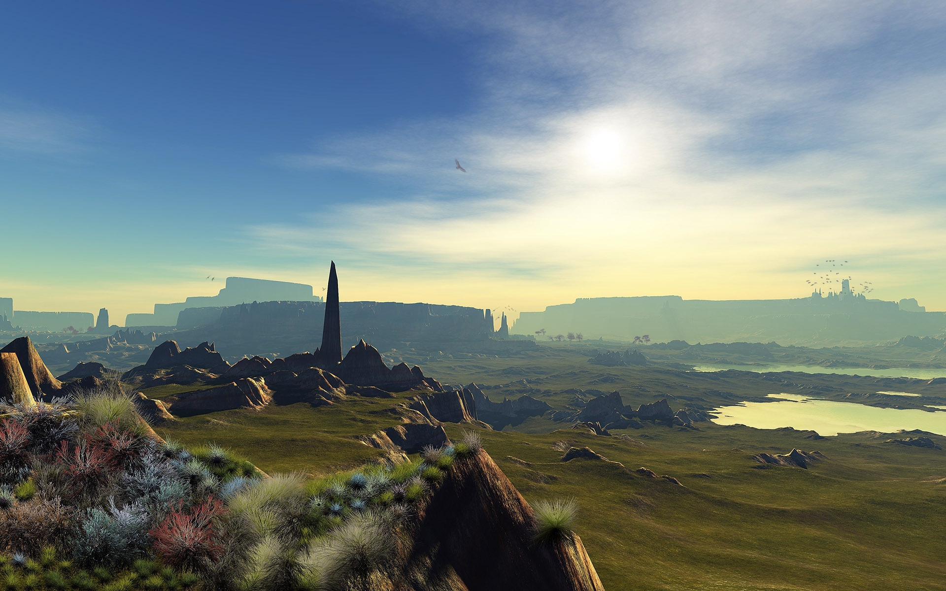 Description: A computer generated image of a landscape with a mountain and a lake in the distance with a bird flying over it.