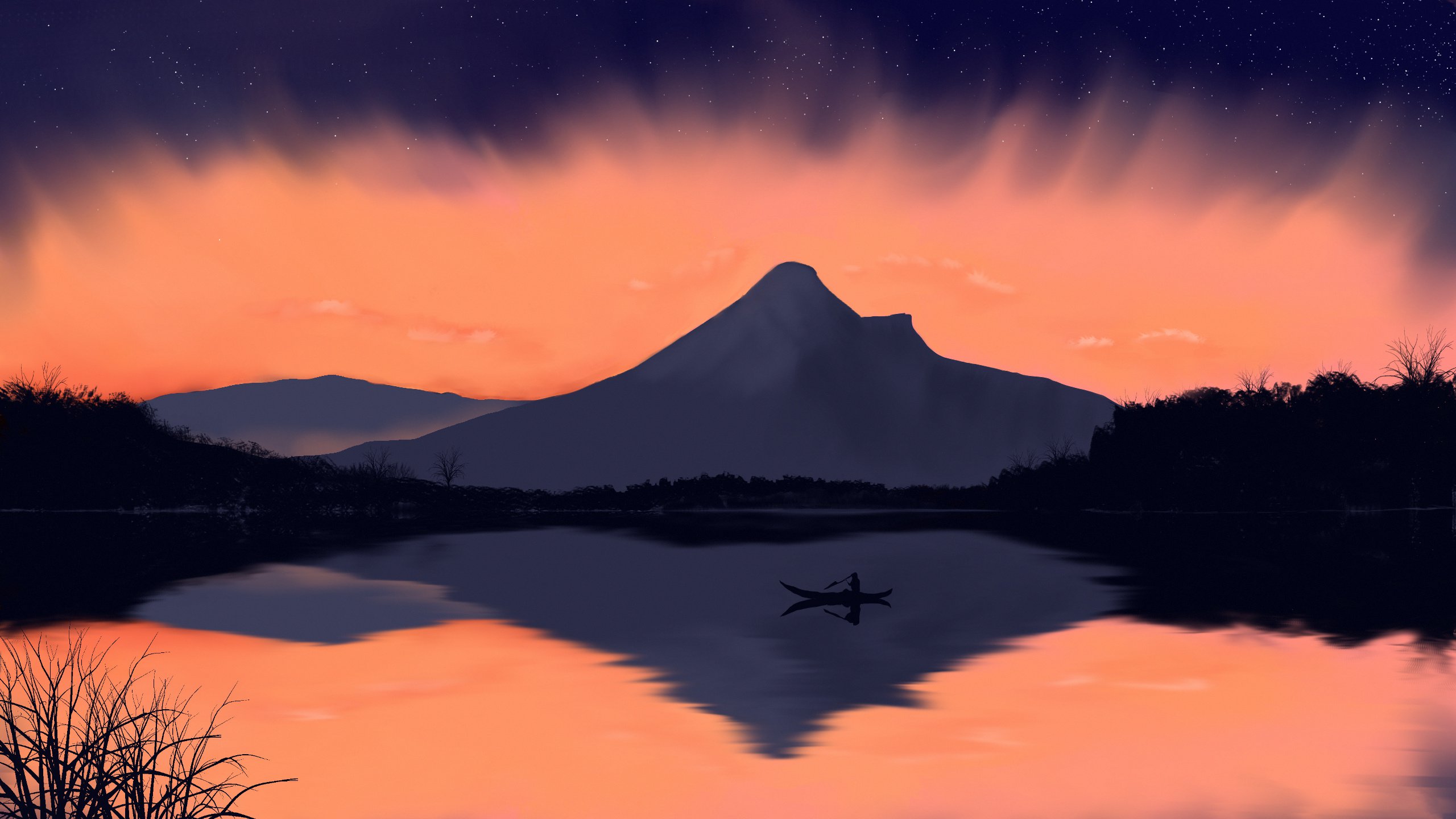 Description: A painting of a mountain with a lake in front of it and a boat in the water at sunset.