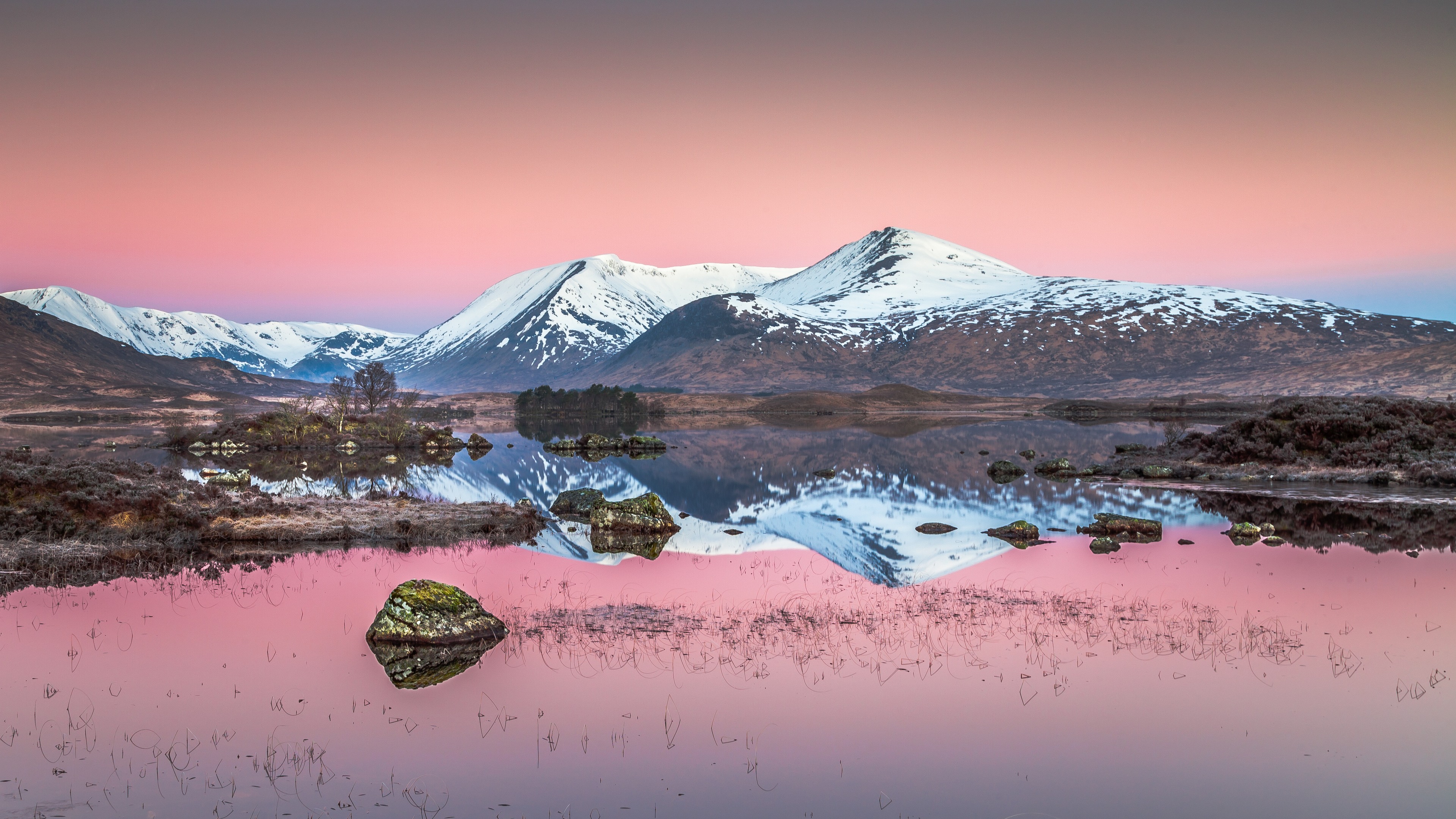 Description: A mountain range with a lake and a boat in the foreground and a pink sky in the background.
