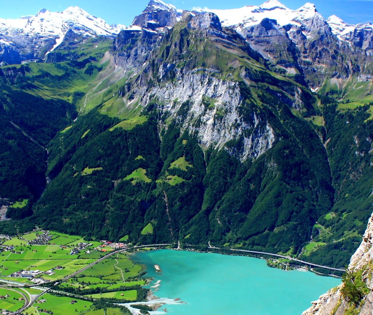 Description: A view of a mountain lake and a valley with a bridge in the middle of it and a mountain range in the background.