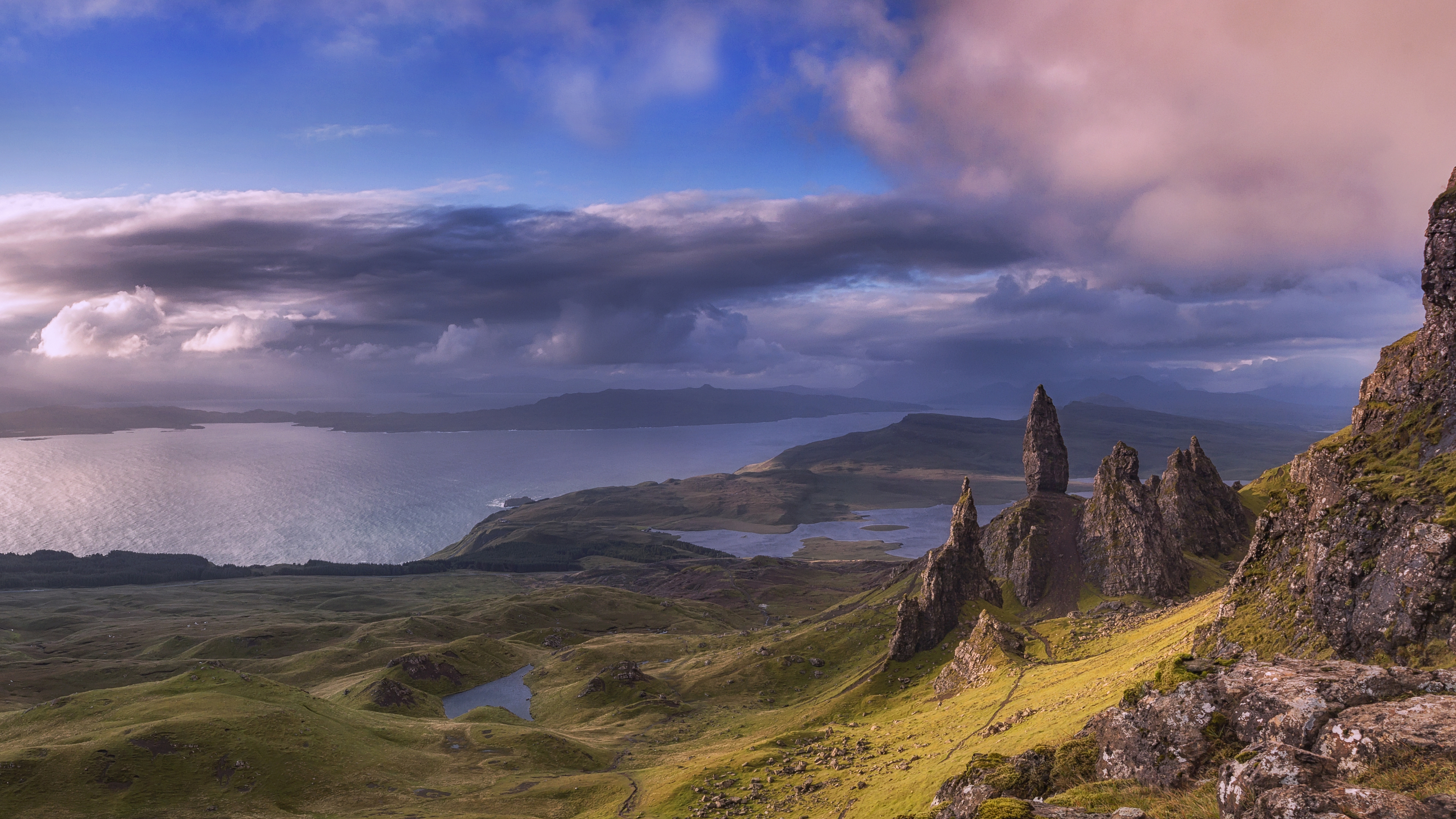 Description: A mountain with a lake in the distance and clouds in the sky above it and a few mountains in the distance.