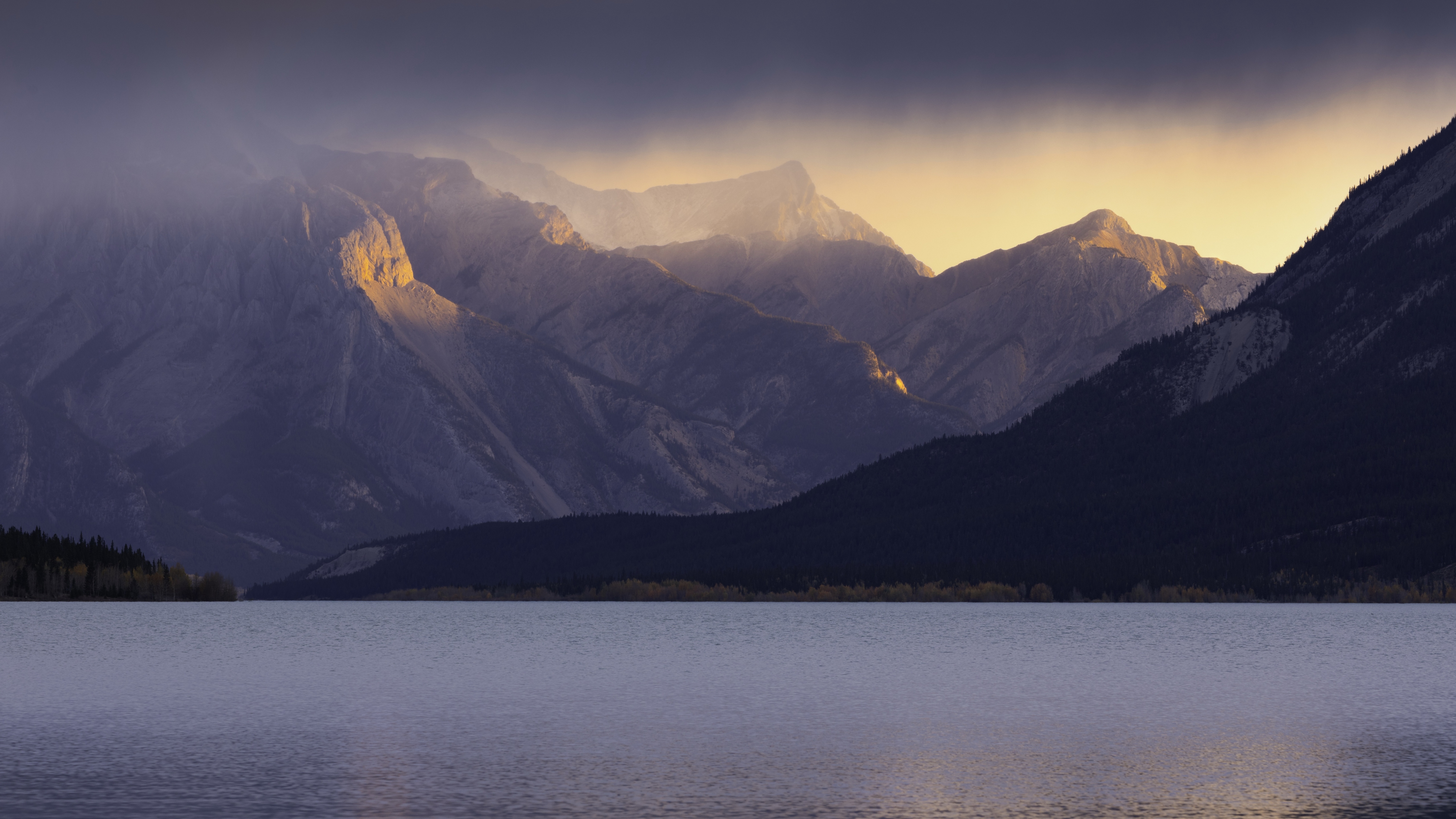 Description: A mountain range with a lake in the foreground and a cloudy sky in the background with a few clouds.