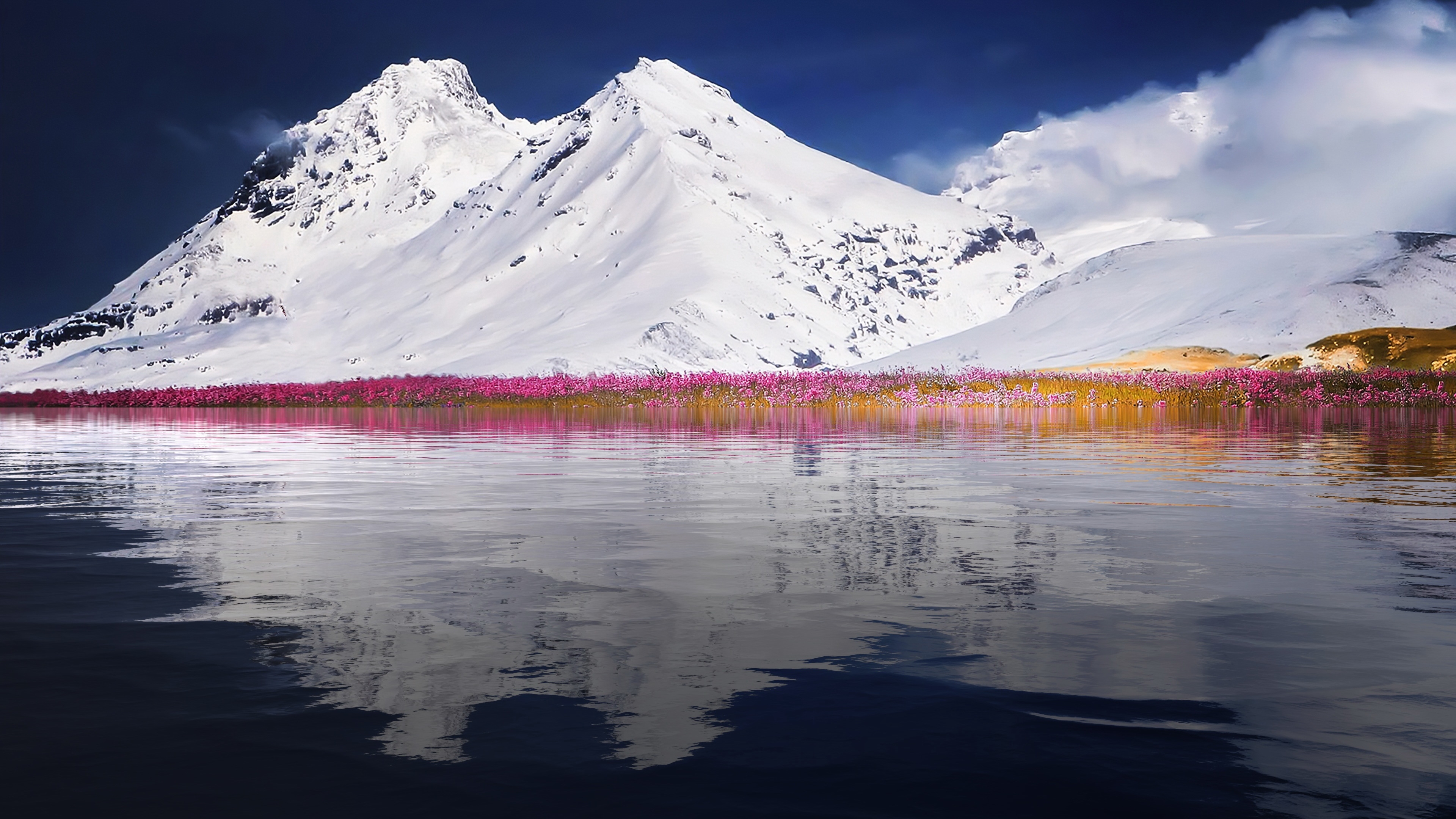 Description: A mountain with a lake in front of it and a sky filled with clouds above it and a few pink flowers in the foreground.