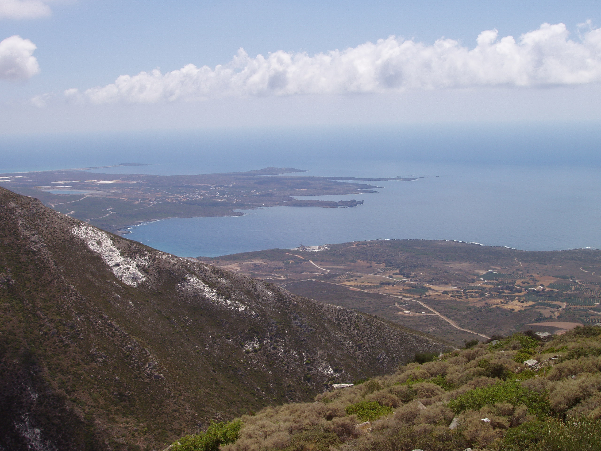 Description: A view of a mountain with a lake in the distance and a few clouds in the sky above it.