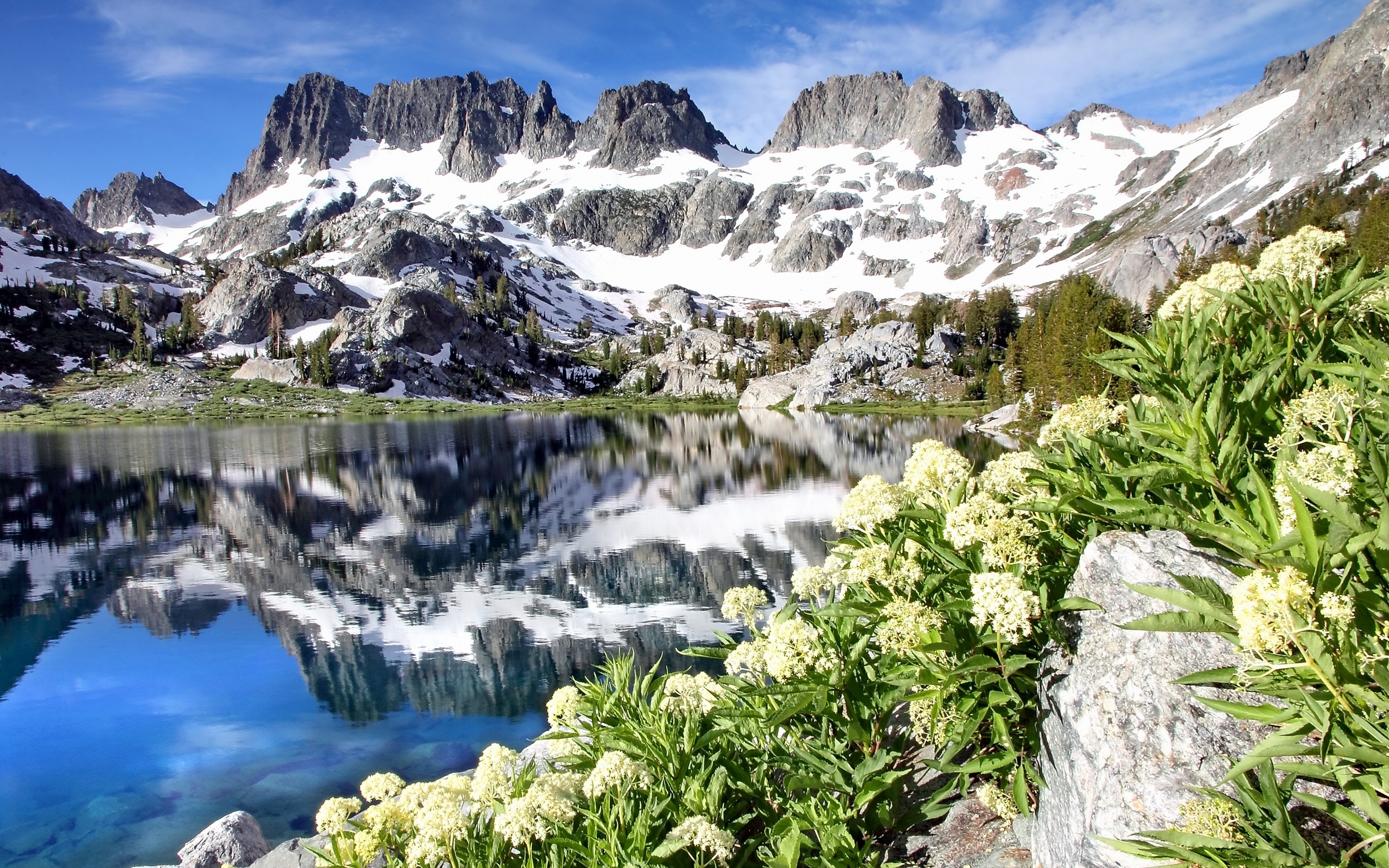 Description: A mountain range with a lake surrounded by flowers and trees in the foreground and a snow covered mountain in the background.