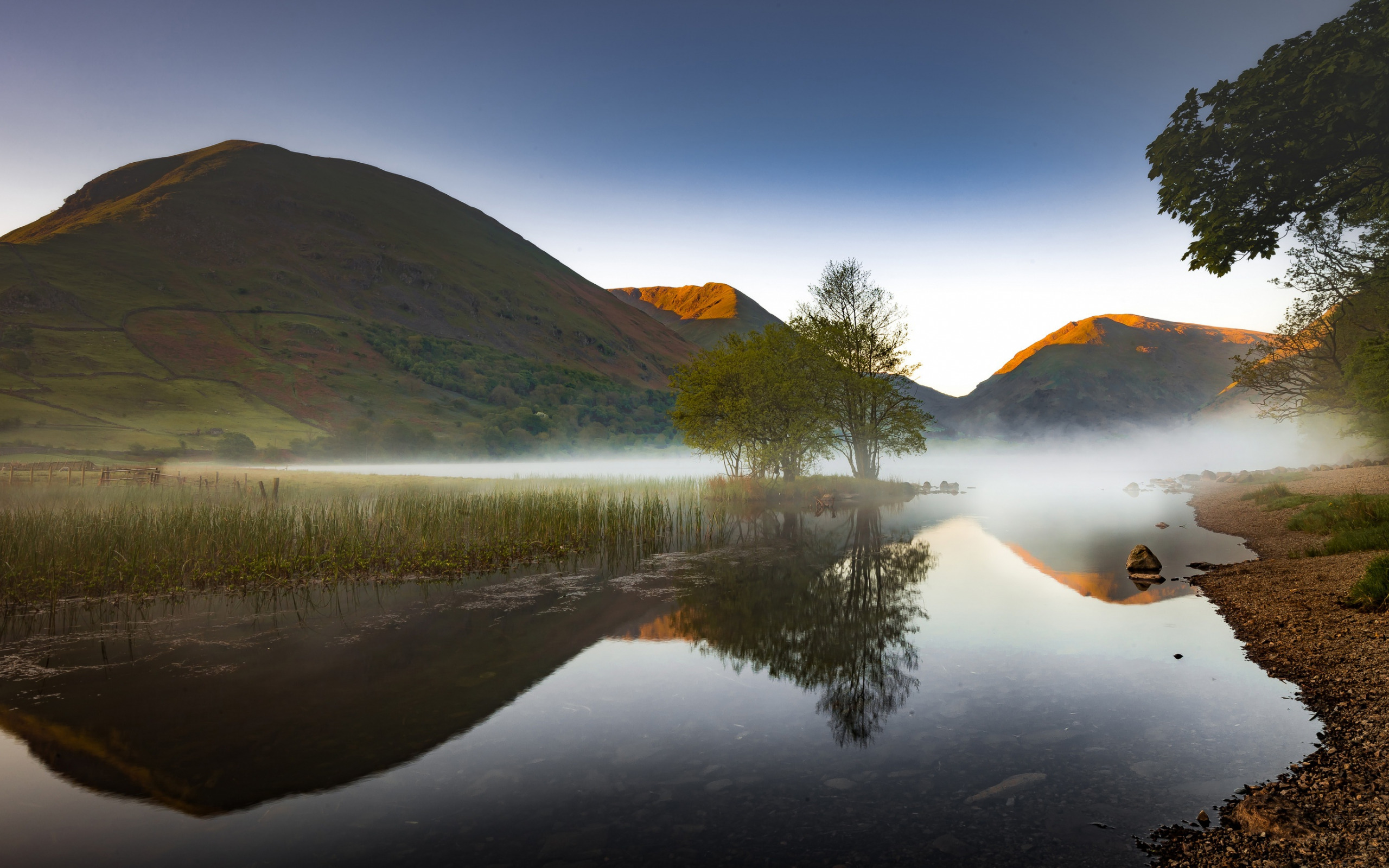 Description: A lake surrounded by mountains and fog in the air with a person sitting on a boat in the water.
