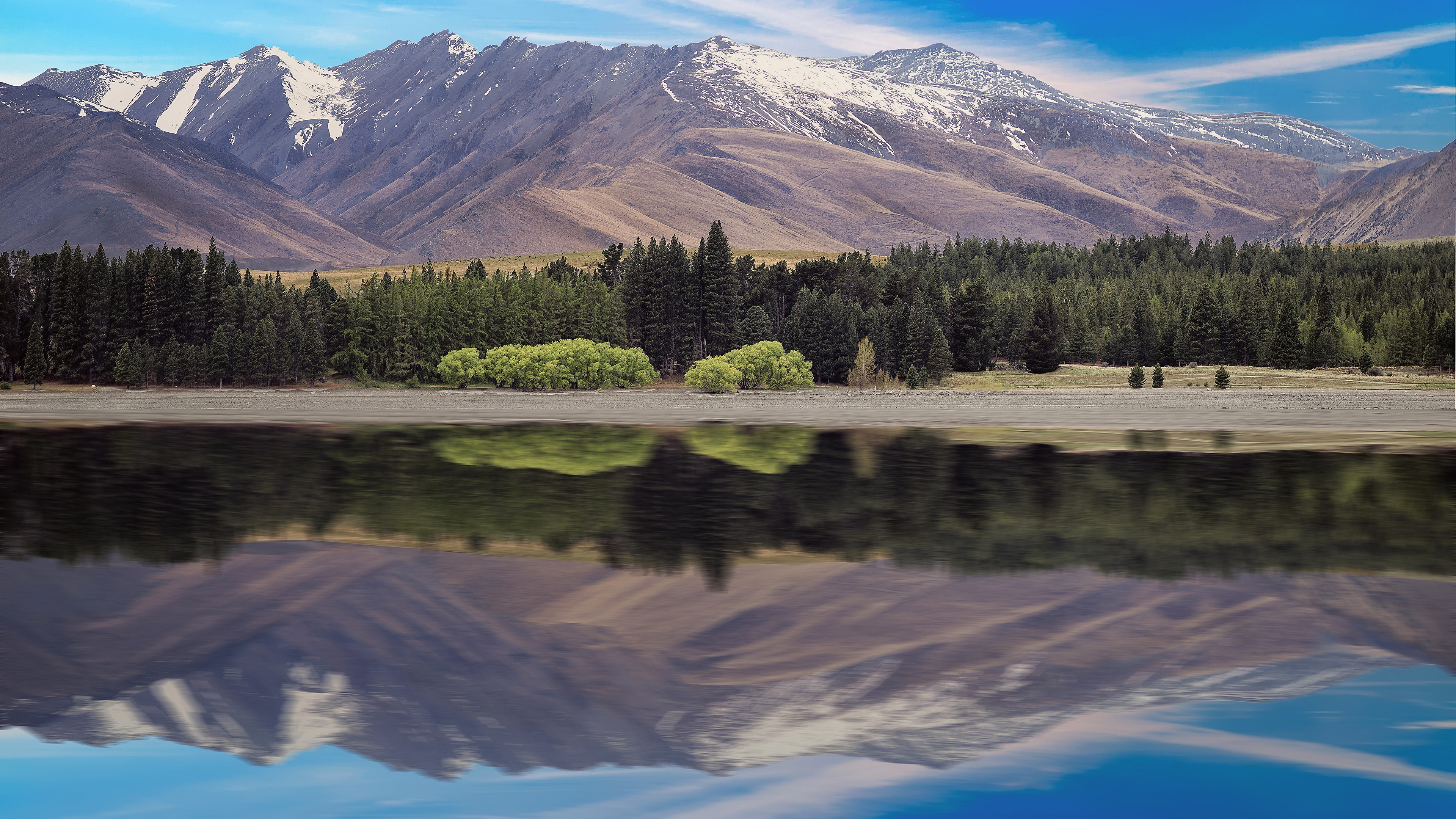 Description: A mountain range with a lake and trees in the foreground and a blue sky with clouds in the background.