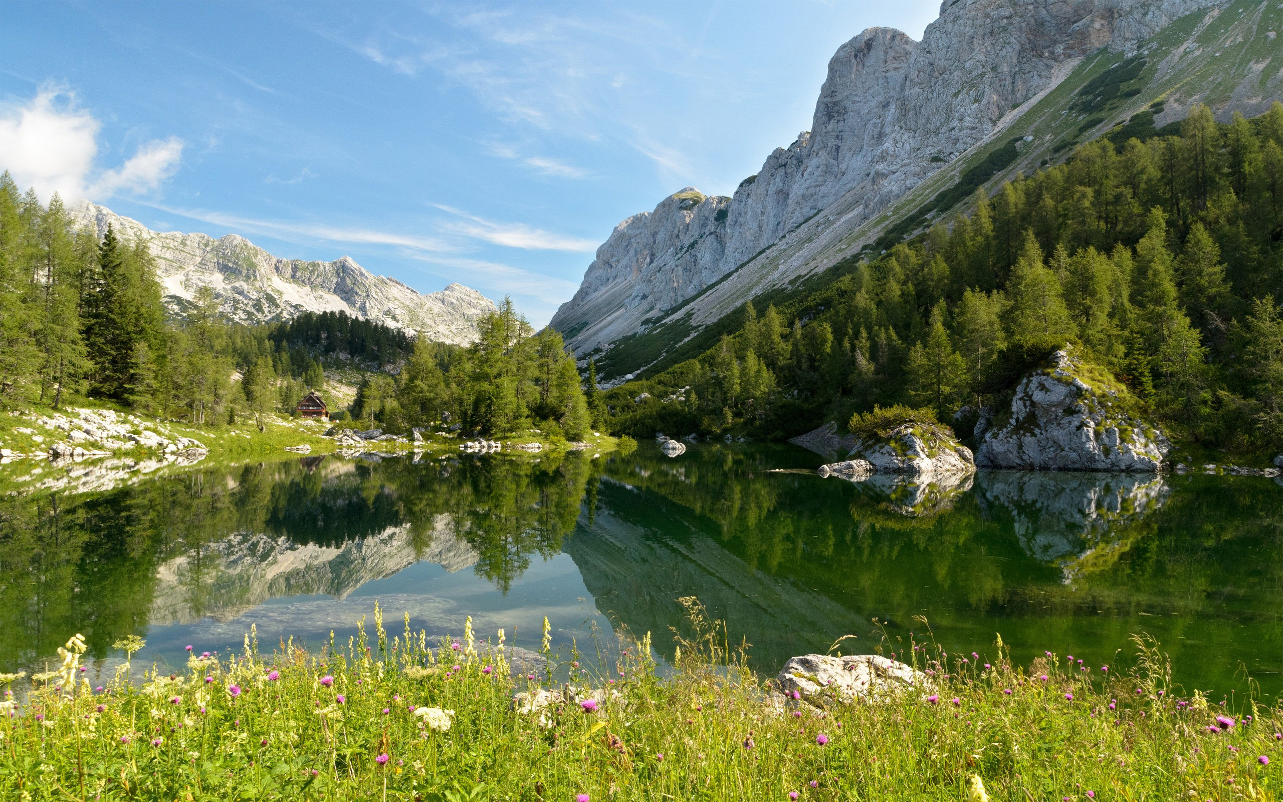 Description: A mountain lake surrounded by trees and flowers in the foreground with a blue sky and clouds in the background.