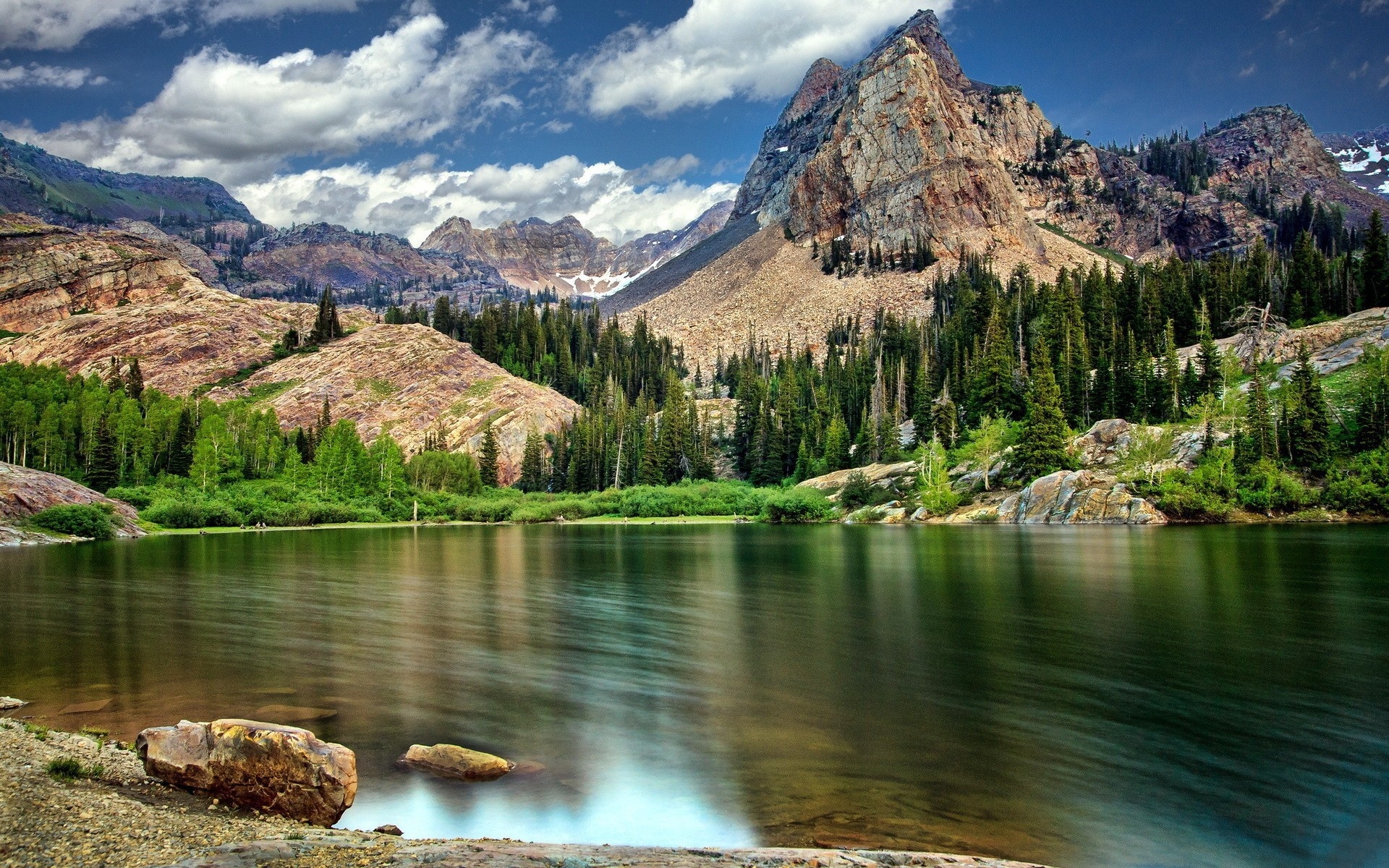 Description: A mountain lake surrounded by trees and rocks with a sky background and clouds in the sky above it and a few rocks in the water below.