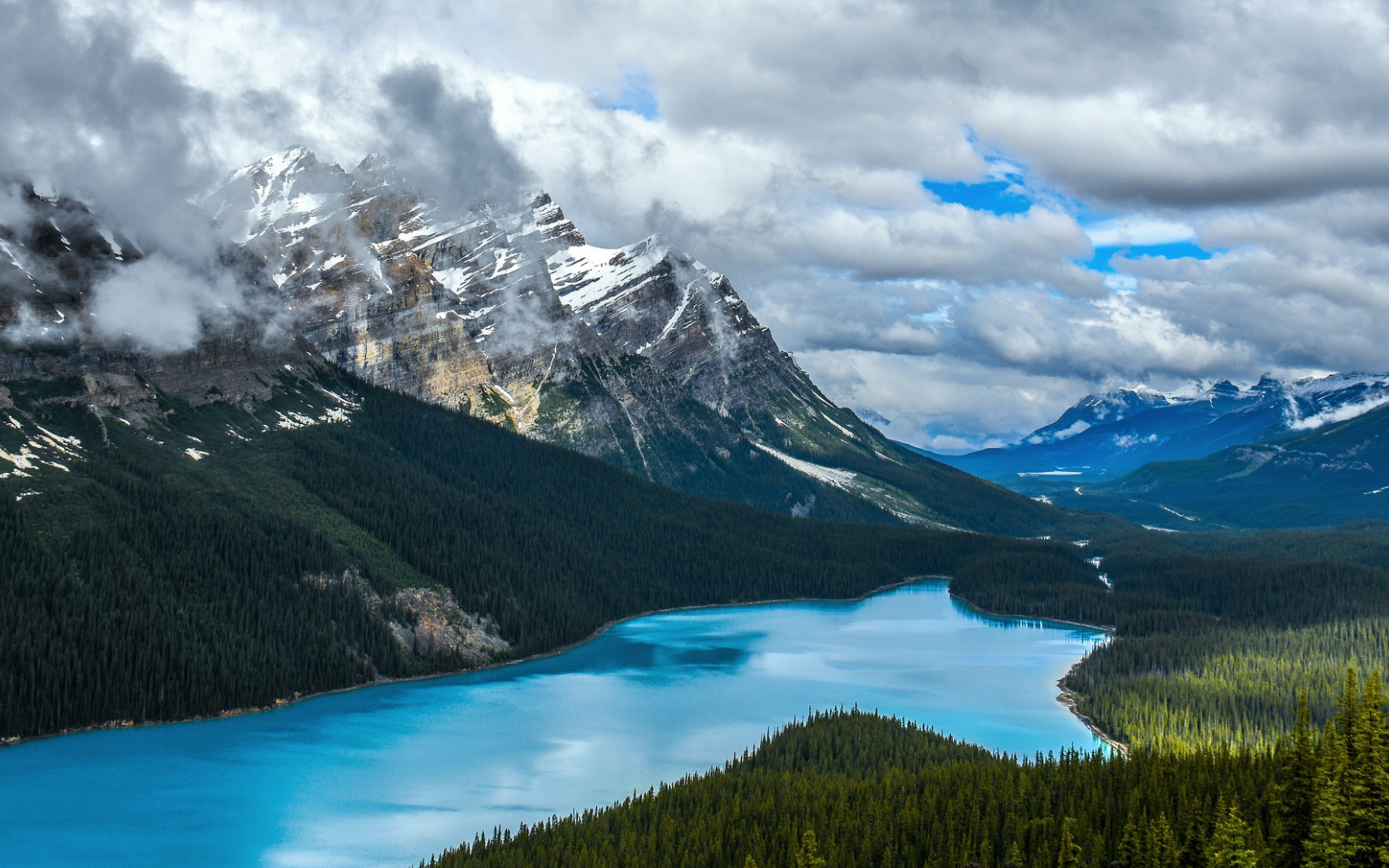 Description: A mountain range with a lake in the middle of it and a forest in the foreground with a blue lake in the middle.