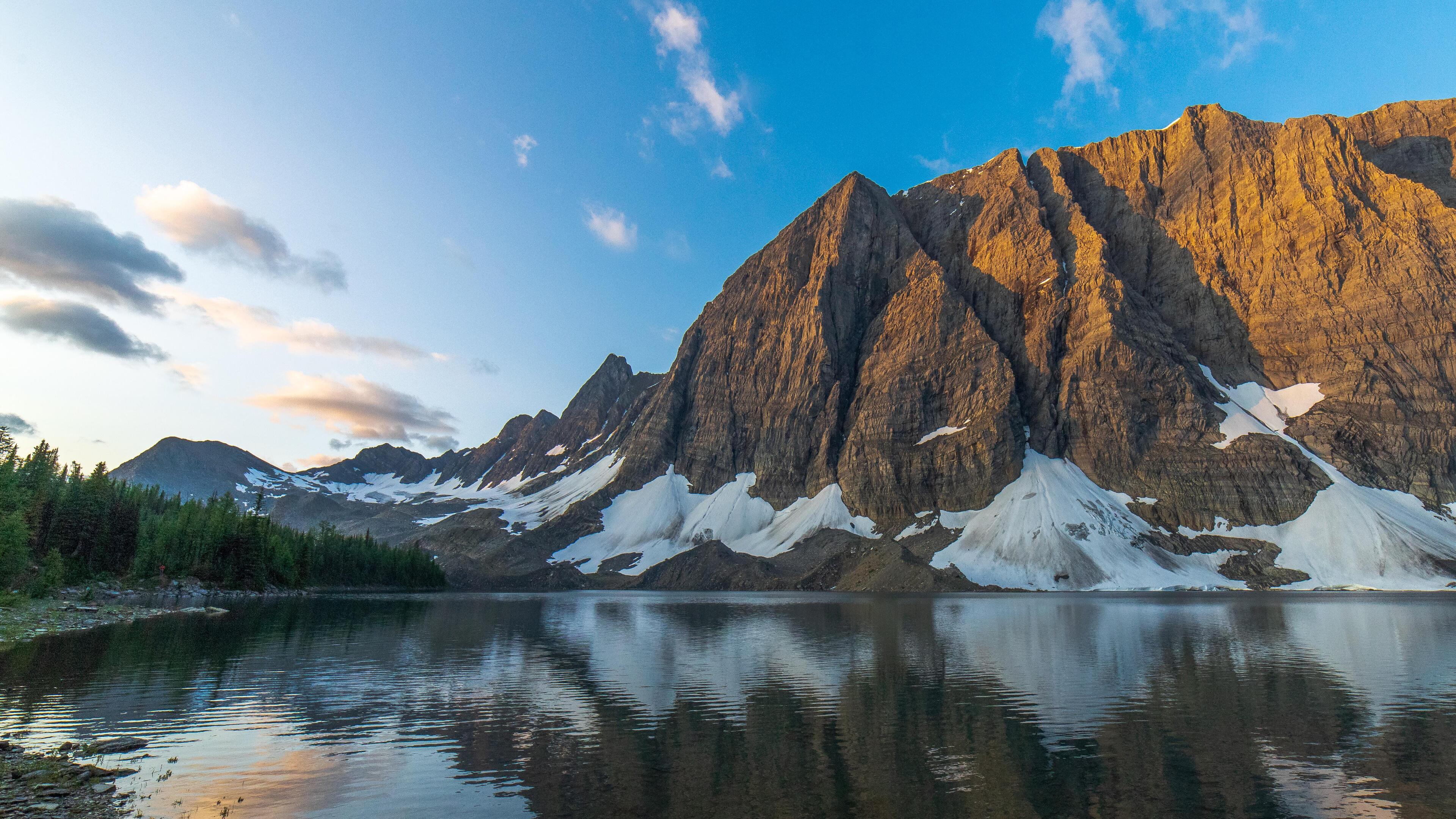 Description: A mountain range with a lake in front of it and a forest in the foreground with a blue sky.