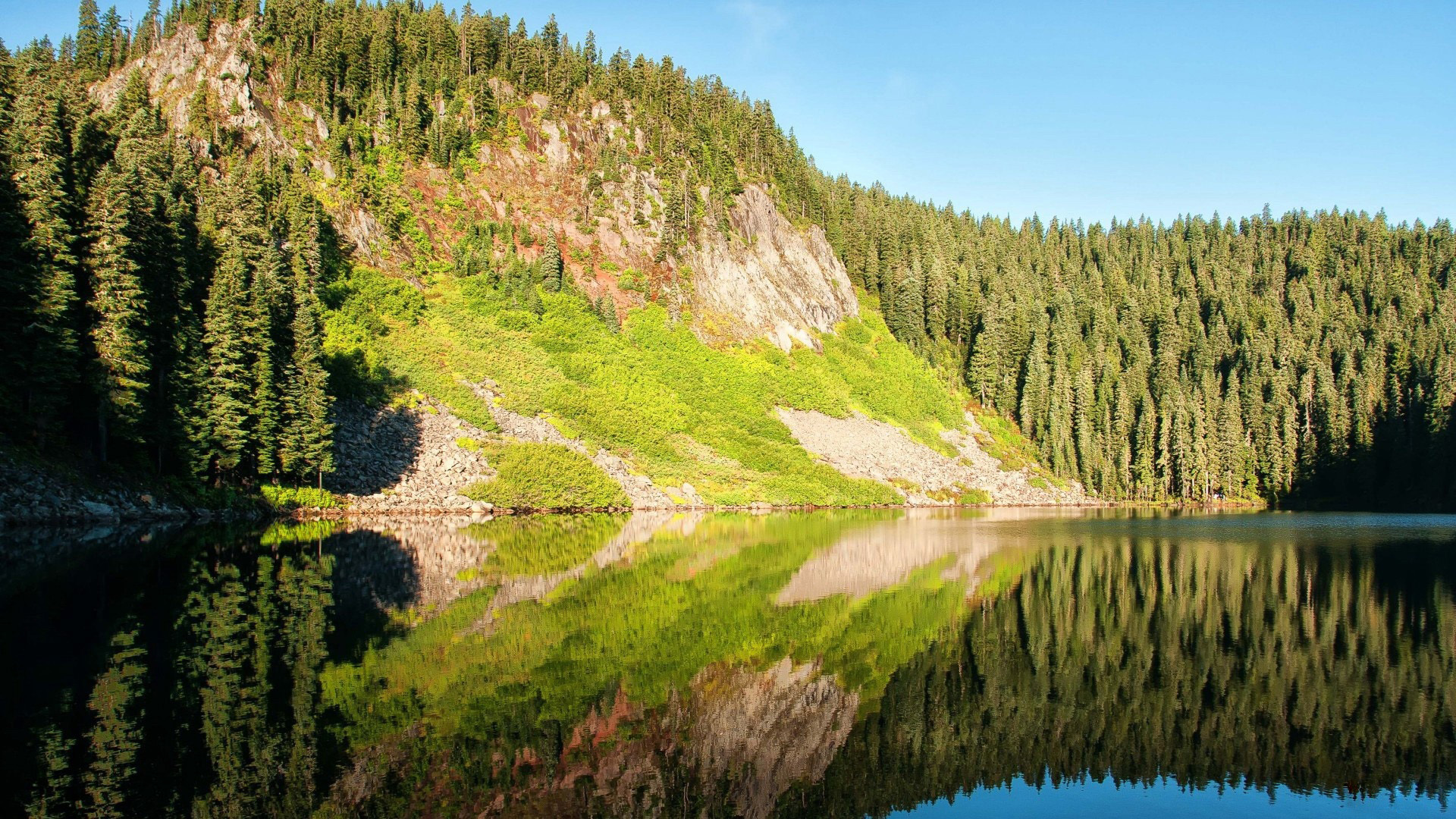 Description: A mountain lake with a forest in the background and a clear sky above it with a few clouds in the sky.