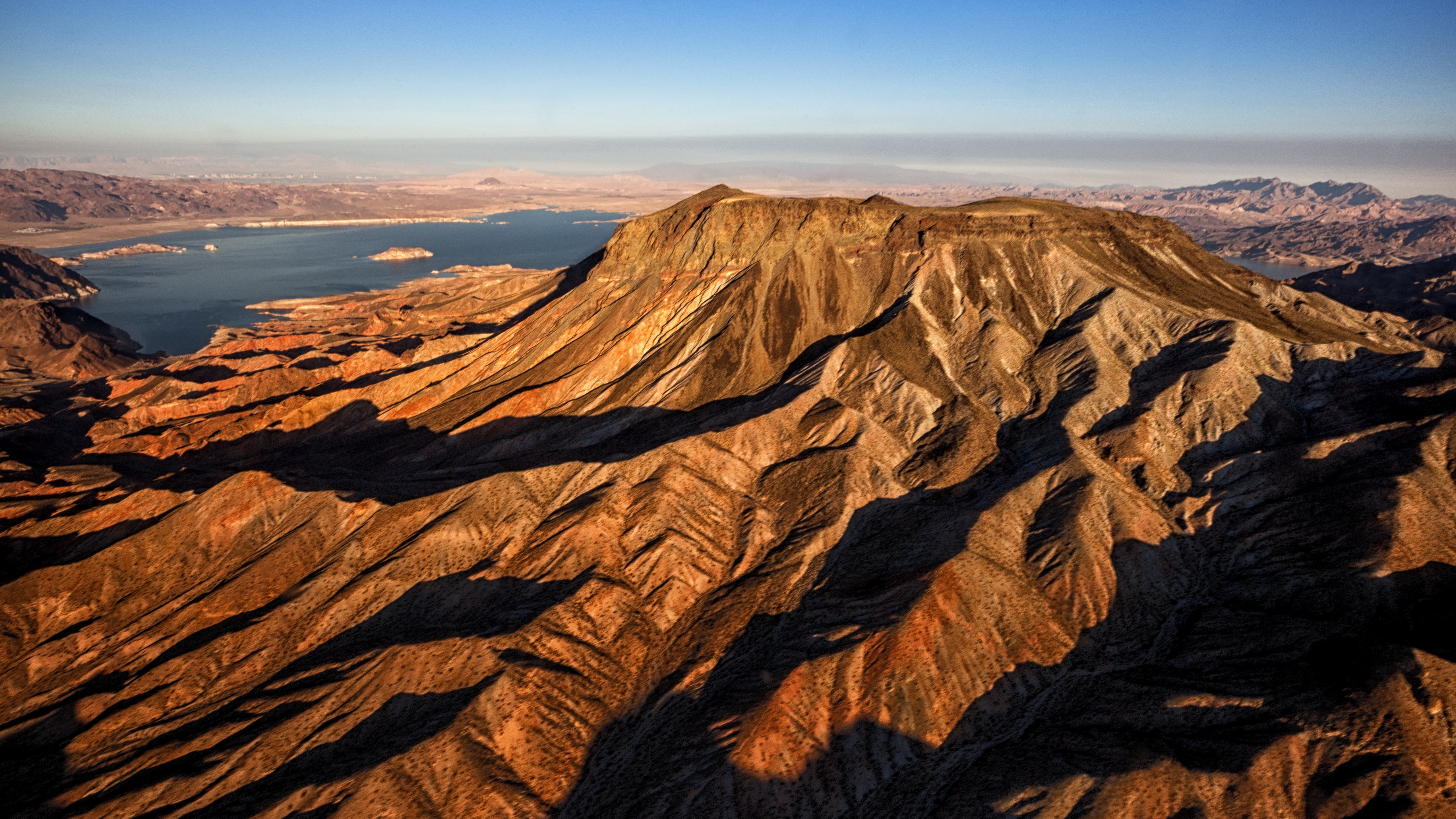 Description: A mountain with a lake in the middle of it and a blue sky above it with a few clouds.