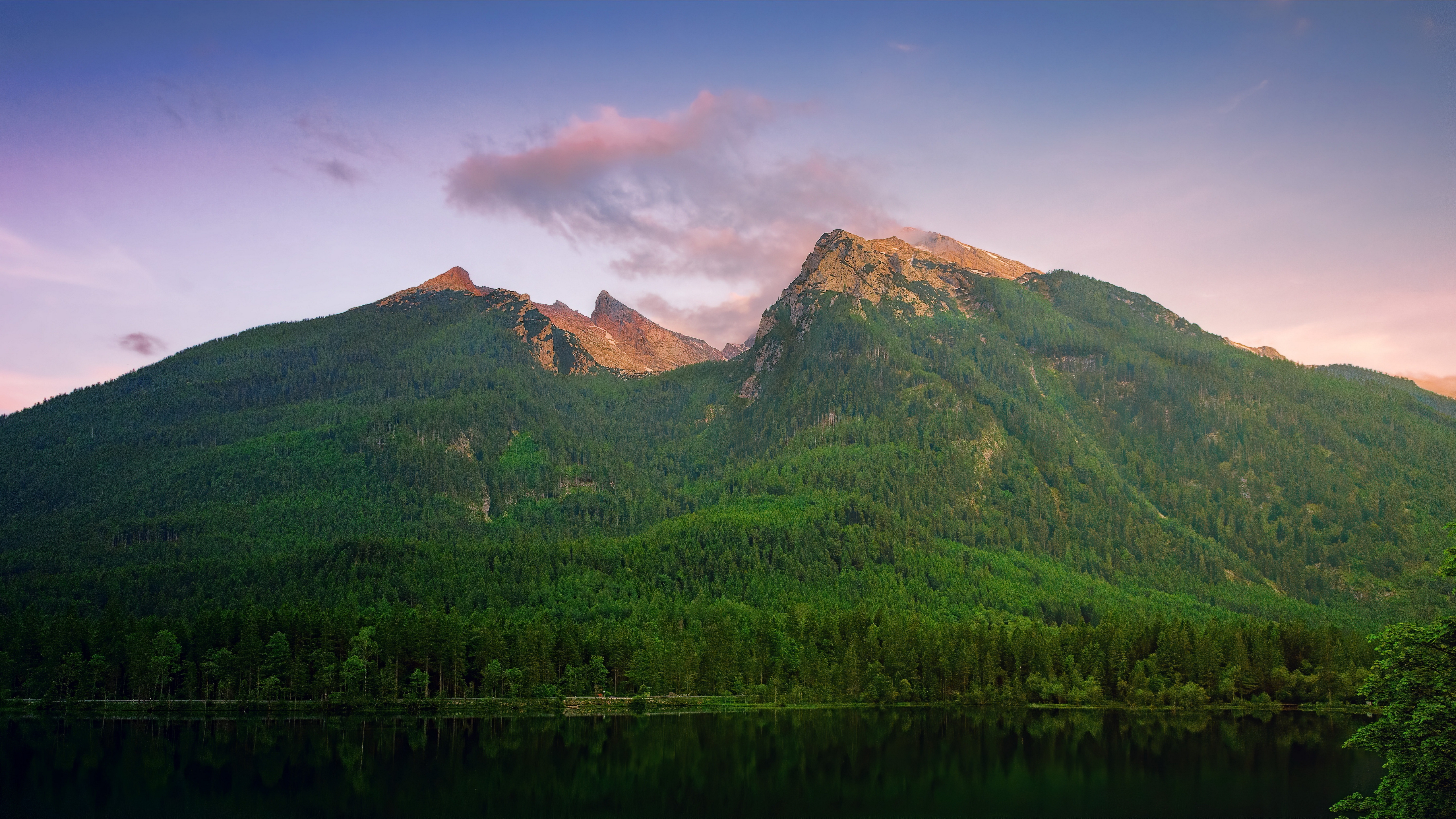 Description: A mountain range with a lake in front of it and a forest in the foreground with a pink sky.