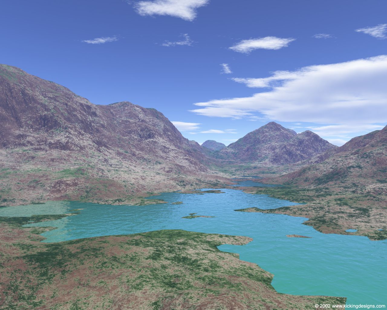 Description: A scenic view of a mountain lake surrounded by mountains and grass in the foreground with a blue sky.