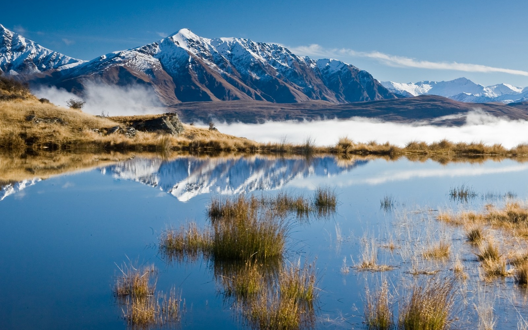 Description: A mountain range with a lake surrounded by grass and bushes in the foreground and a few clouds in the distance.