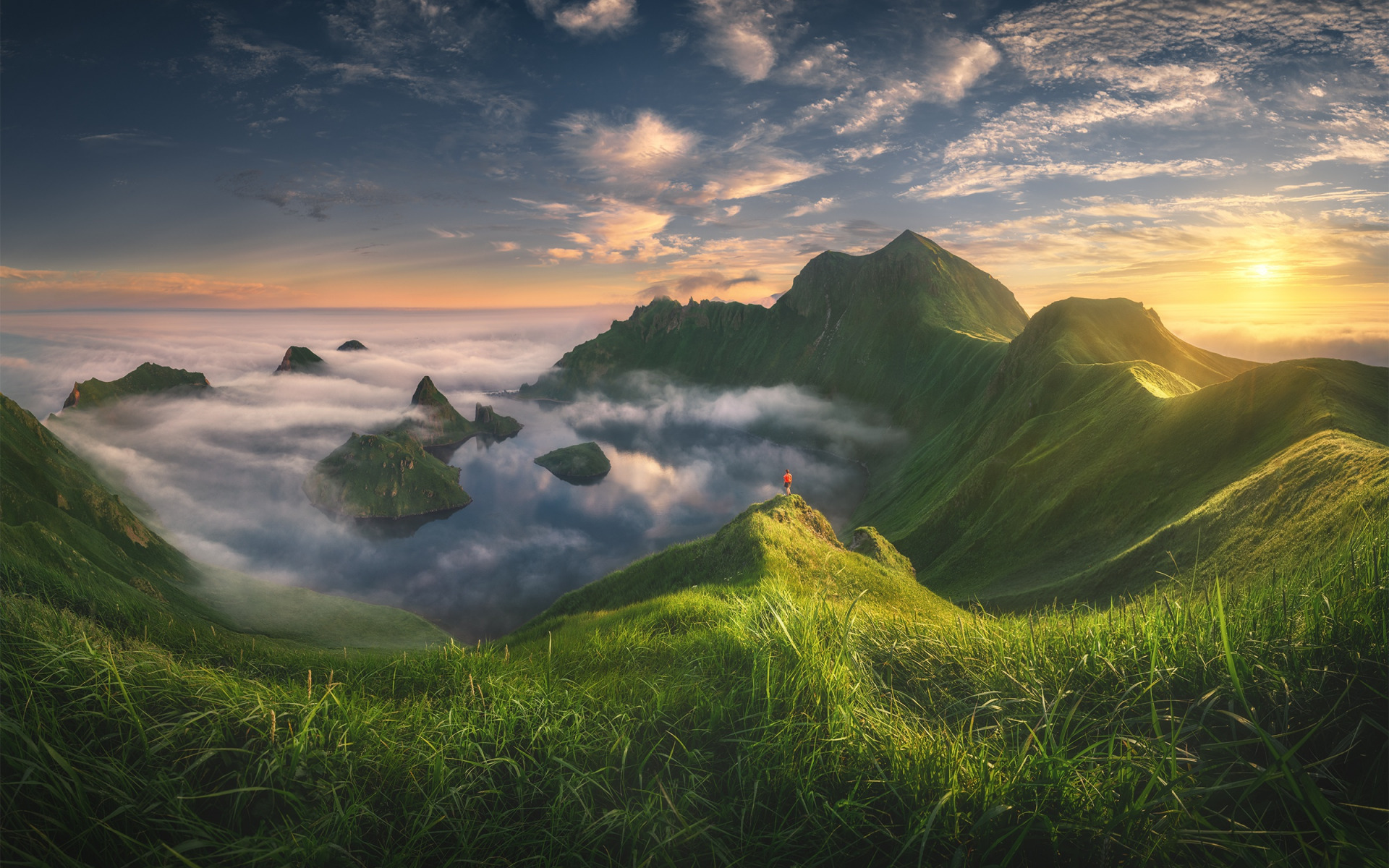 Description: A person standing on a grassy hill with a view of a mountain range and a lake below it with low lying clouds.