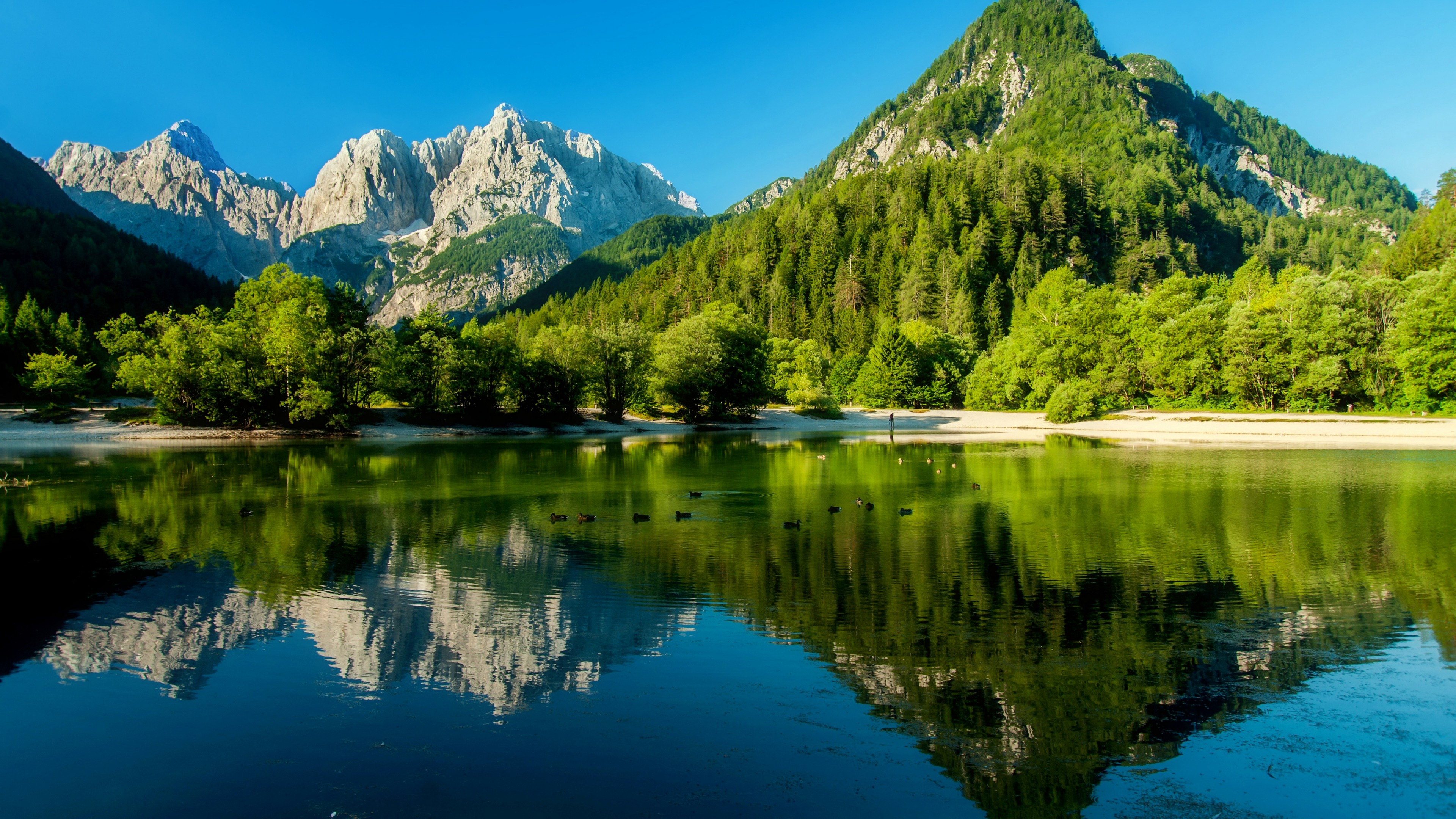 Description: A mountain range is reflected in a lake surrounded by trees and mountains in the background.