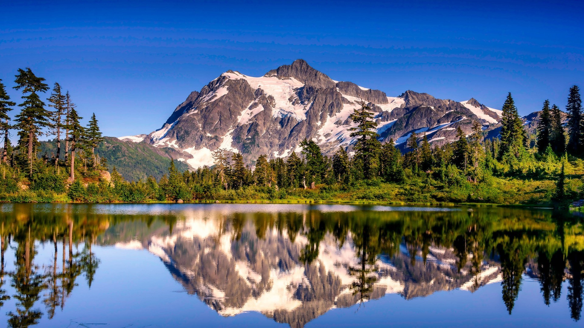 Description: A mountain range is reflected in a lake surrounded by trees and a forest with a blue sky in the background.