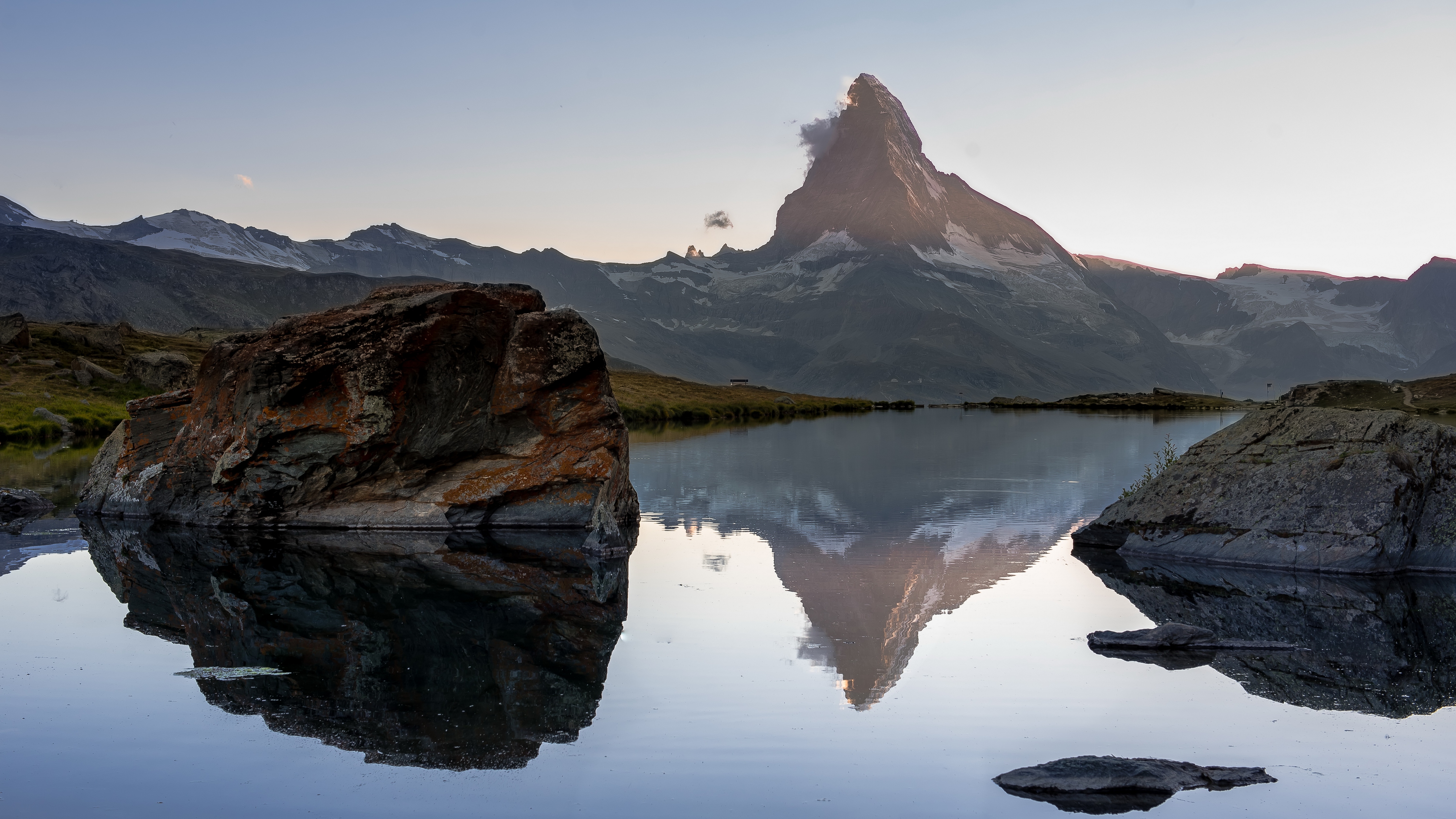 Description: A mountain range with a lake in front of it and a rock in the foreground with a reflection of the mountain in the water.