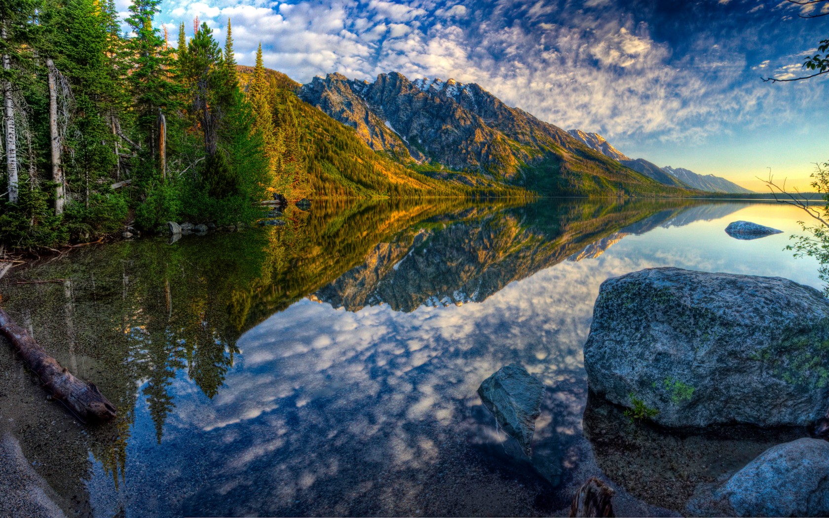 Description: A mountain lake surrounded by trees and rocks with a sky filled with clouds above it and a few trees.