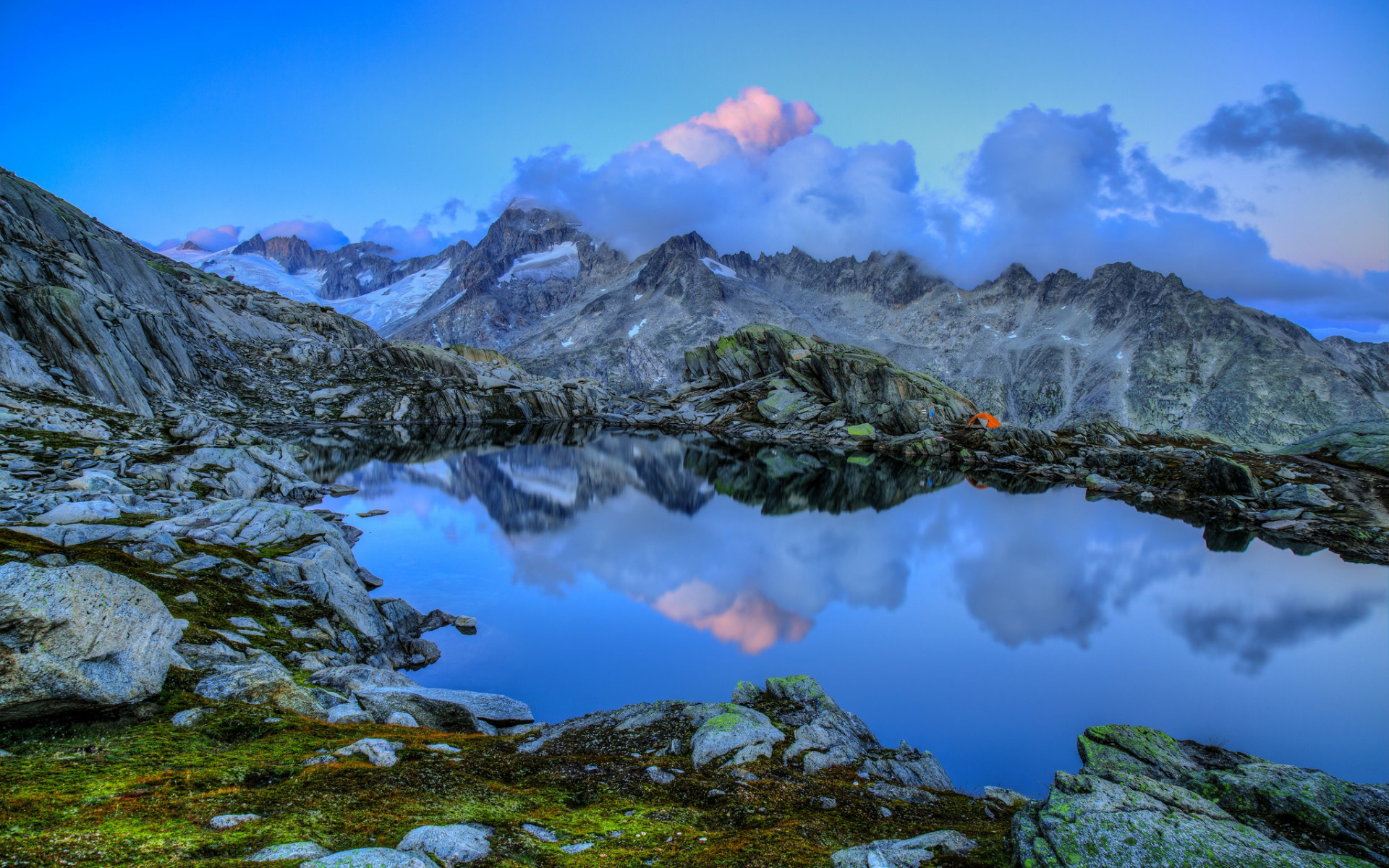 Description: A mountain lake surrounded by rocks and grass with a sky background and clouds in the sky above it and a few rocks and grass on the ground.