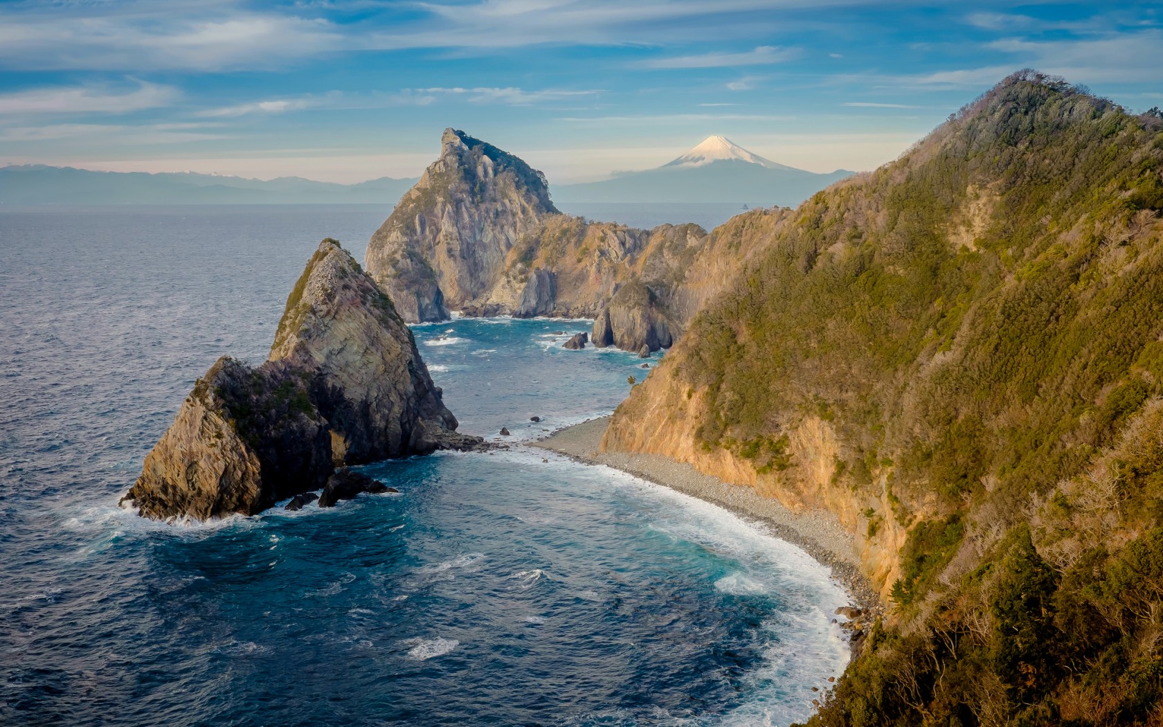 Description: A mountain with a body of water and a mountain in the background with a few rocks on it and a few trees on the side.