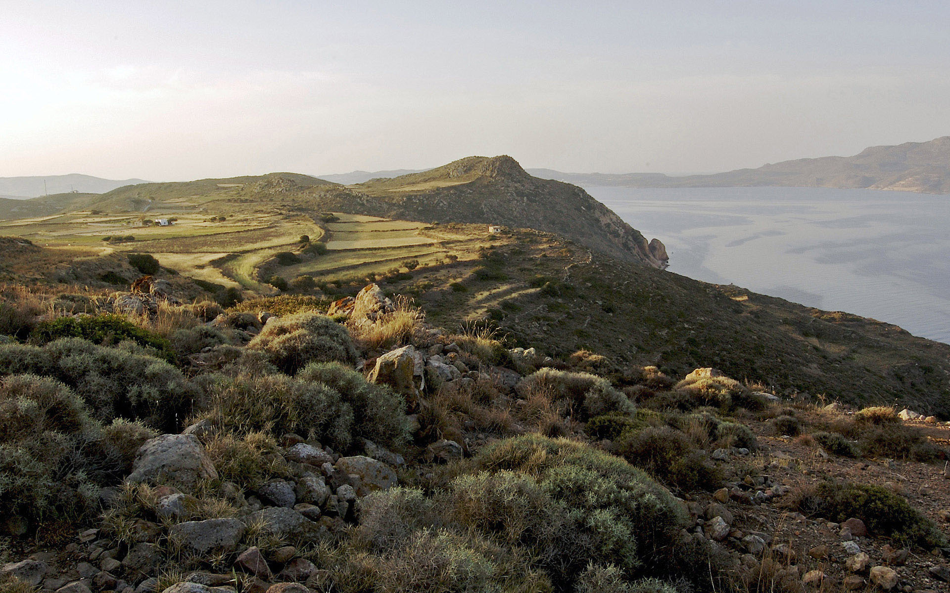 Description: A mountain with a body of water in the distance and a few animals on the side of it.