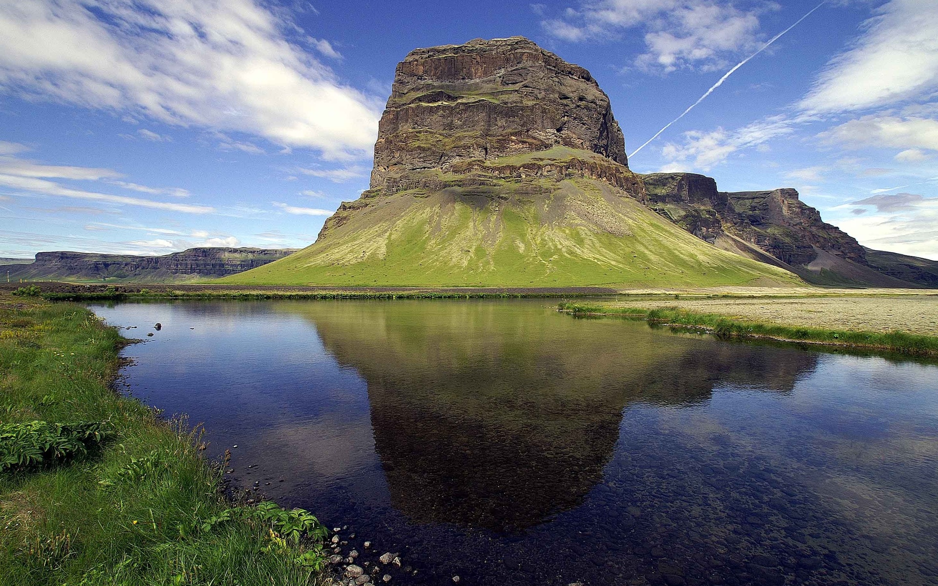 Description: A mountain with a lake in front of it and a sky background with clouds in the sky and a few birds flying in the water.