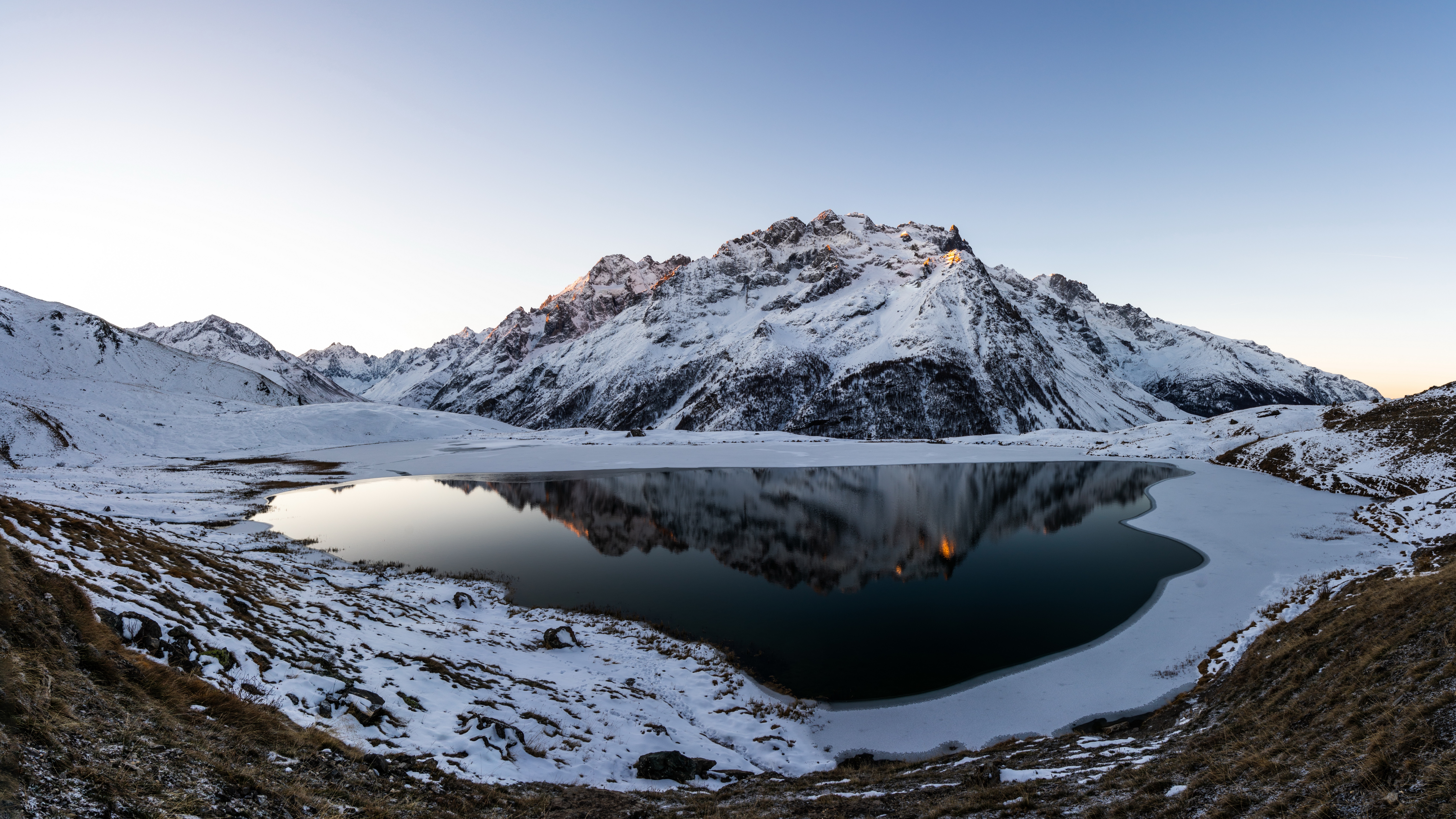 Description: A mountain range with a lake surrounded by snow covered mountains and grass and shrubs.