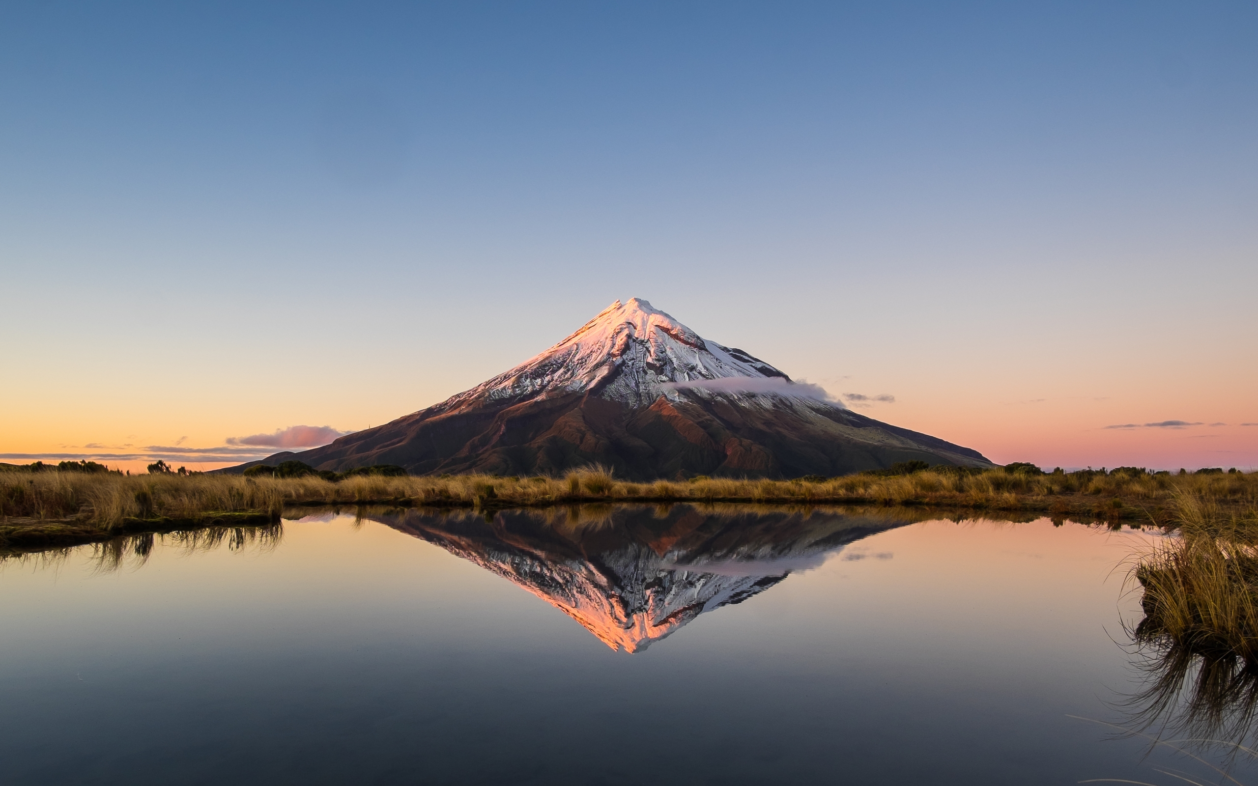 Description: A mountain is shown with a lake in front of it and a sunset in the background with a few clouds.