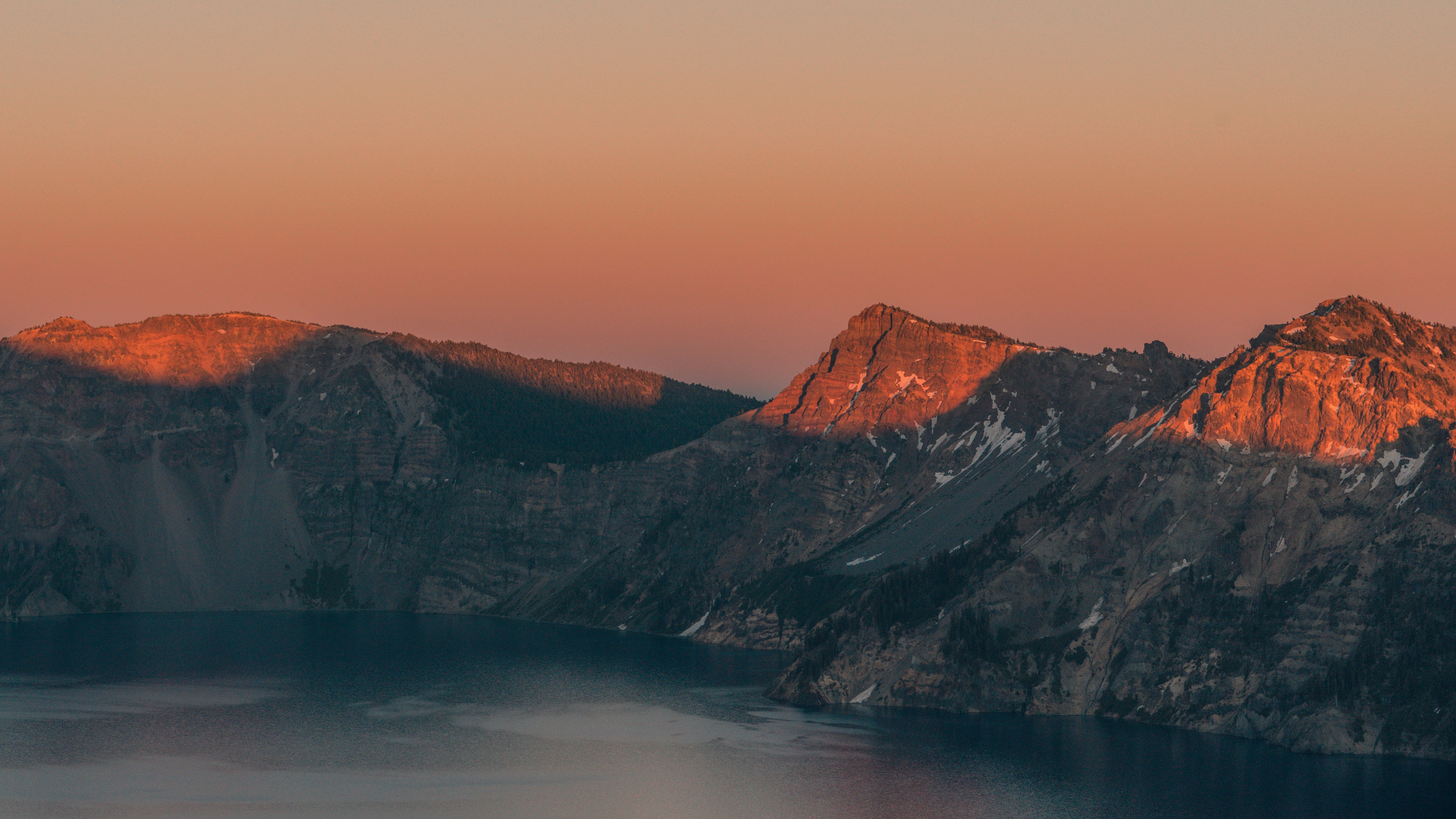 Description: A mountain range with a lake in the foreground and a sunset in the background with a pink sky.