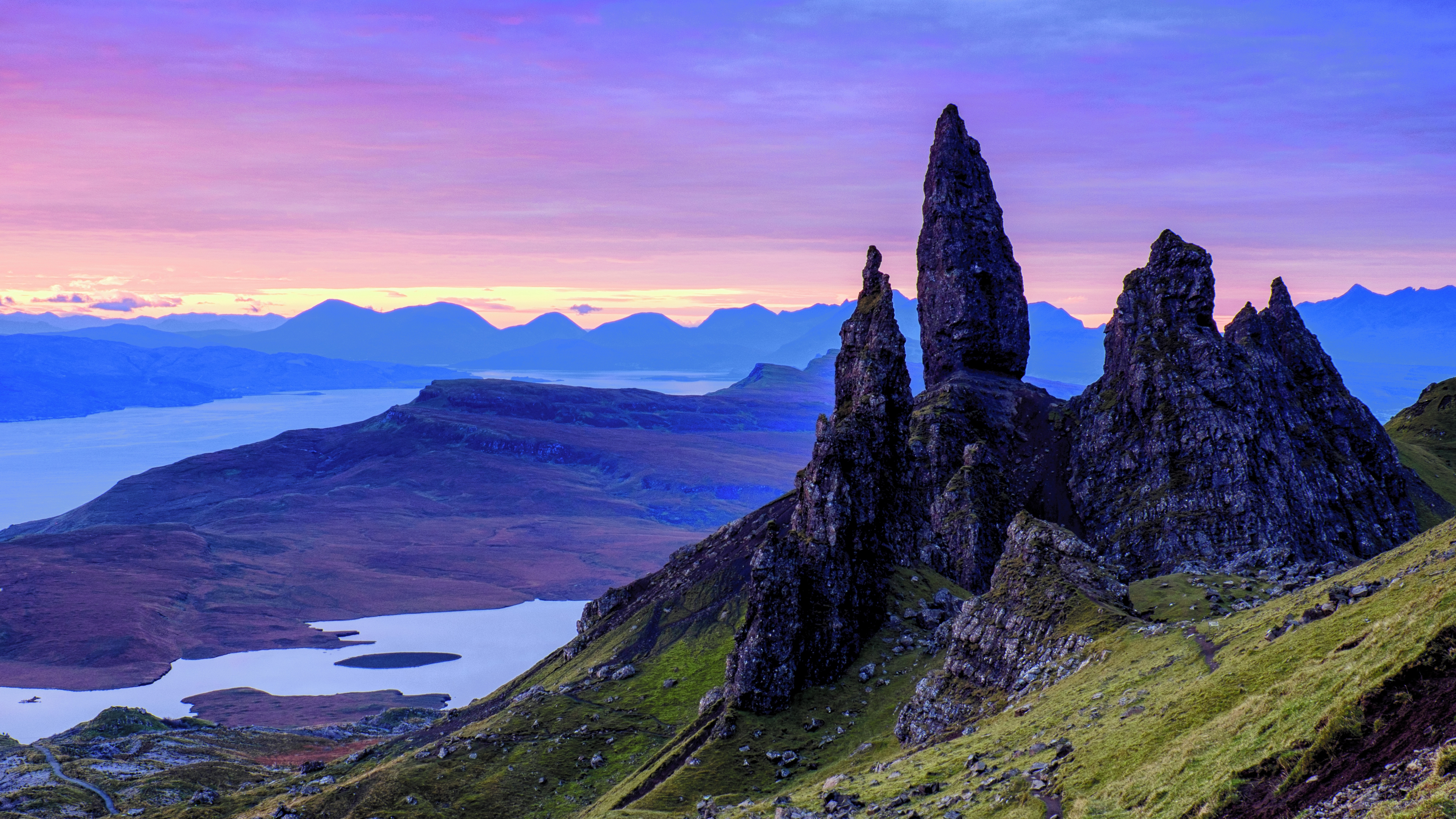 Description: A mountain range with a lake and mountains in the background at sunset with a pink sky and clouds in the distance.