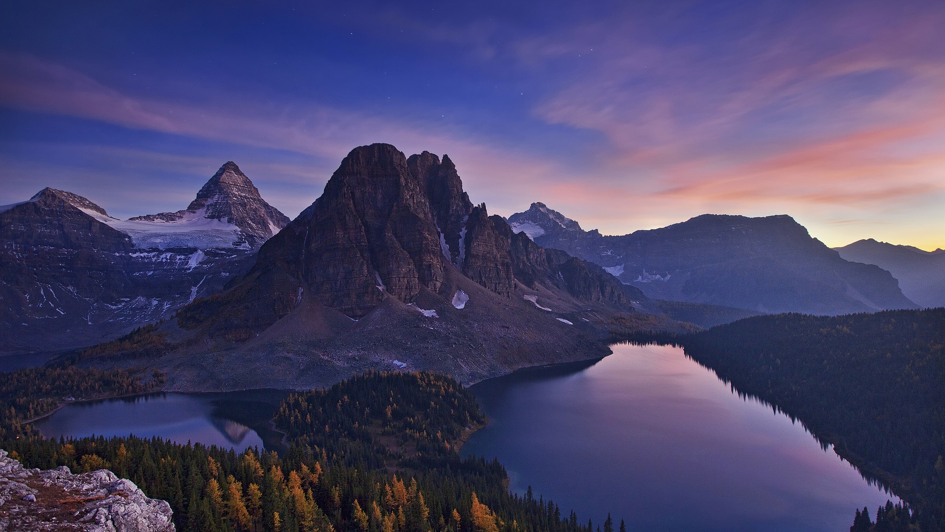 Description: A mountain range with a lake in the foreground and a mountain range in the background with a sunset.