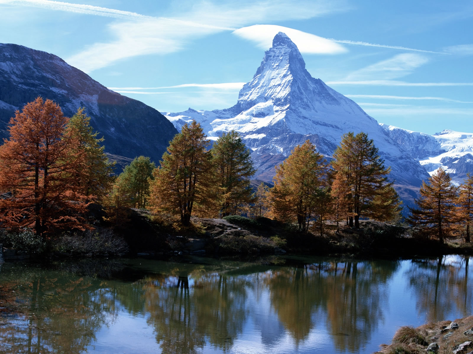 Description: A mountain with a lake in front of it and trees around it with a blue sky and clouds above.