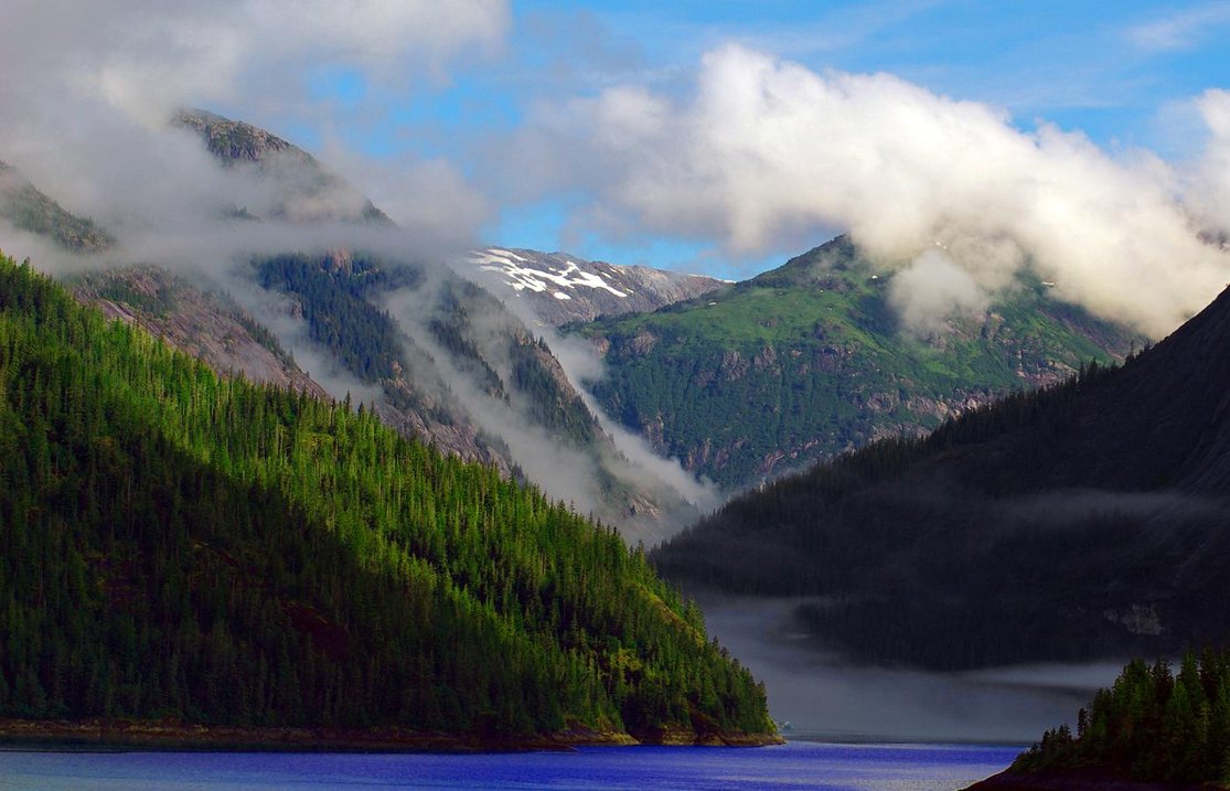 Description: A mountain range with a lake and trees in the foreground and a cloud filled sky above it.