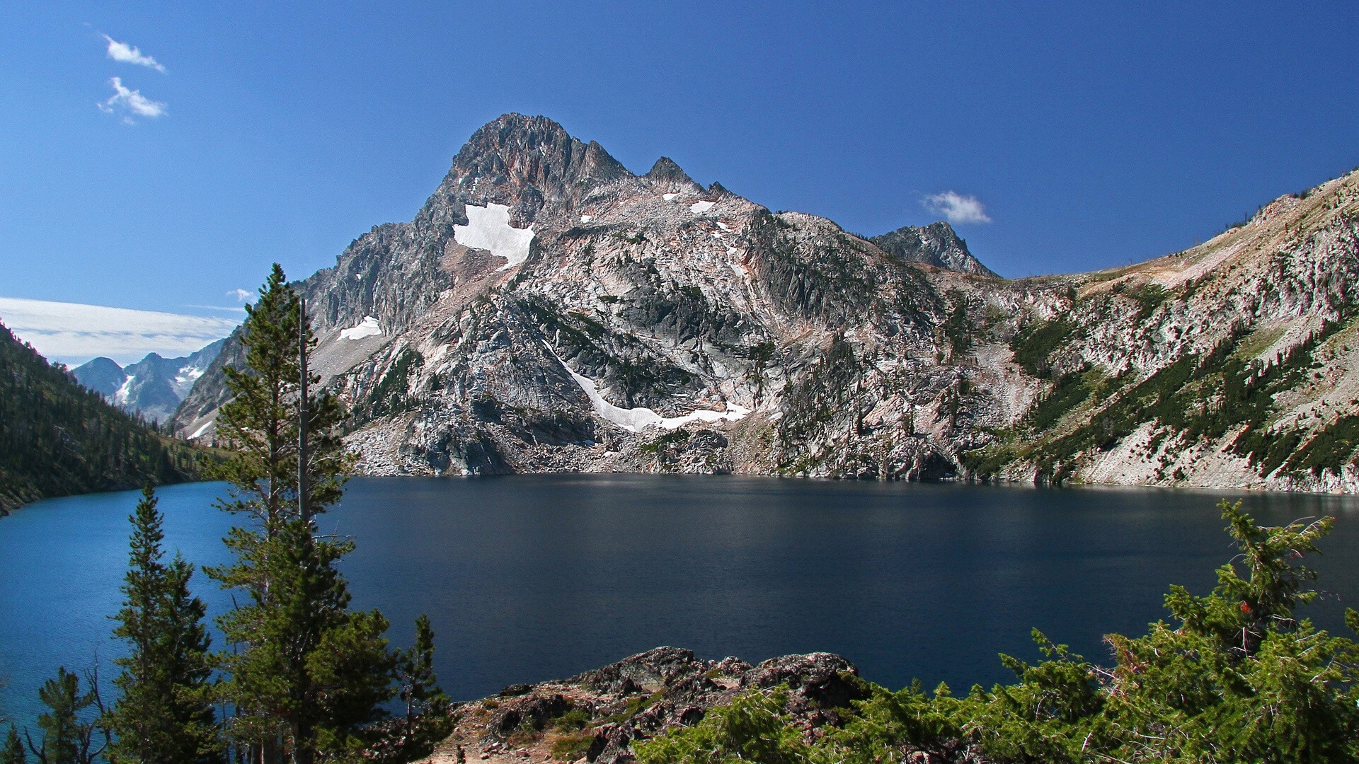 Description: A mountain range with a lake in the foreground and a few trees in the foreground.