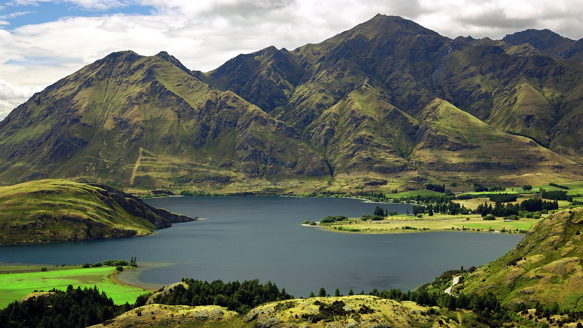 Description: A mountain range with a lake in the middle of it and a few trees on the side of it.