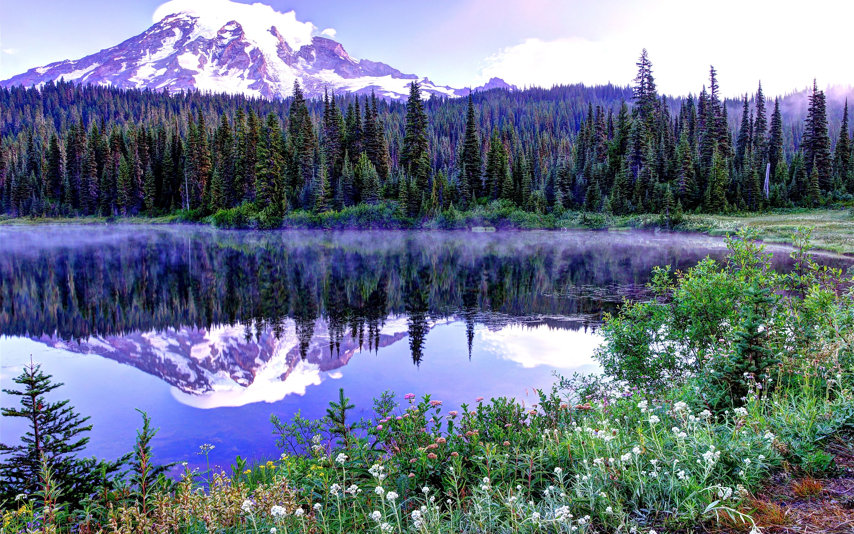 Description: A mountain is in the distance with a lake in front of it and trees around it and a blue sky.