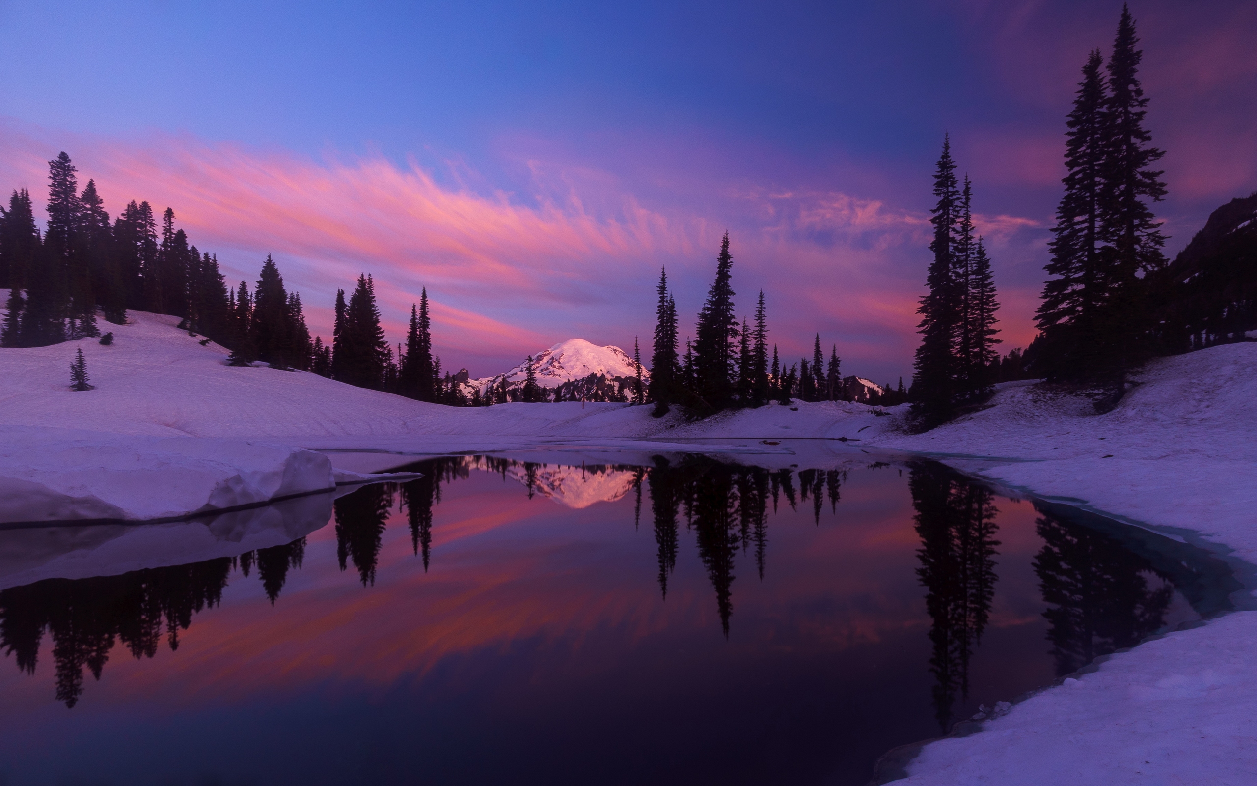 Description: A mountain range with a lake and trees in the foreground and a pink sky with clouds in the background.